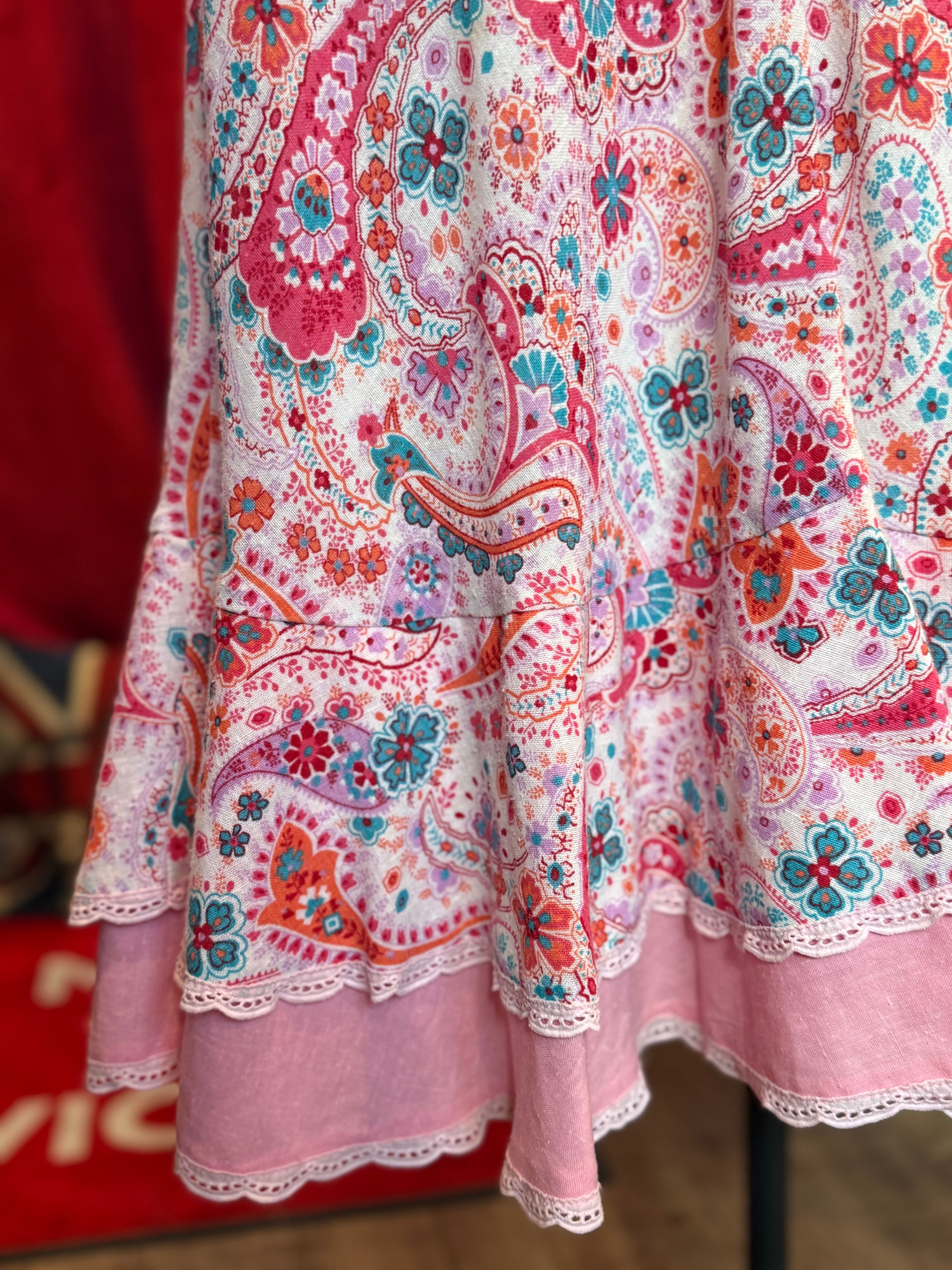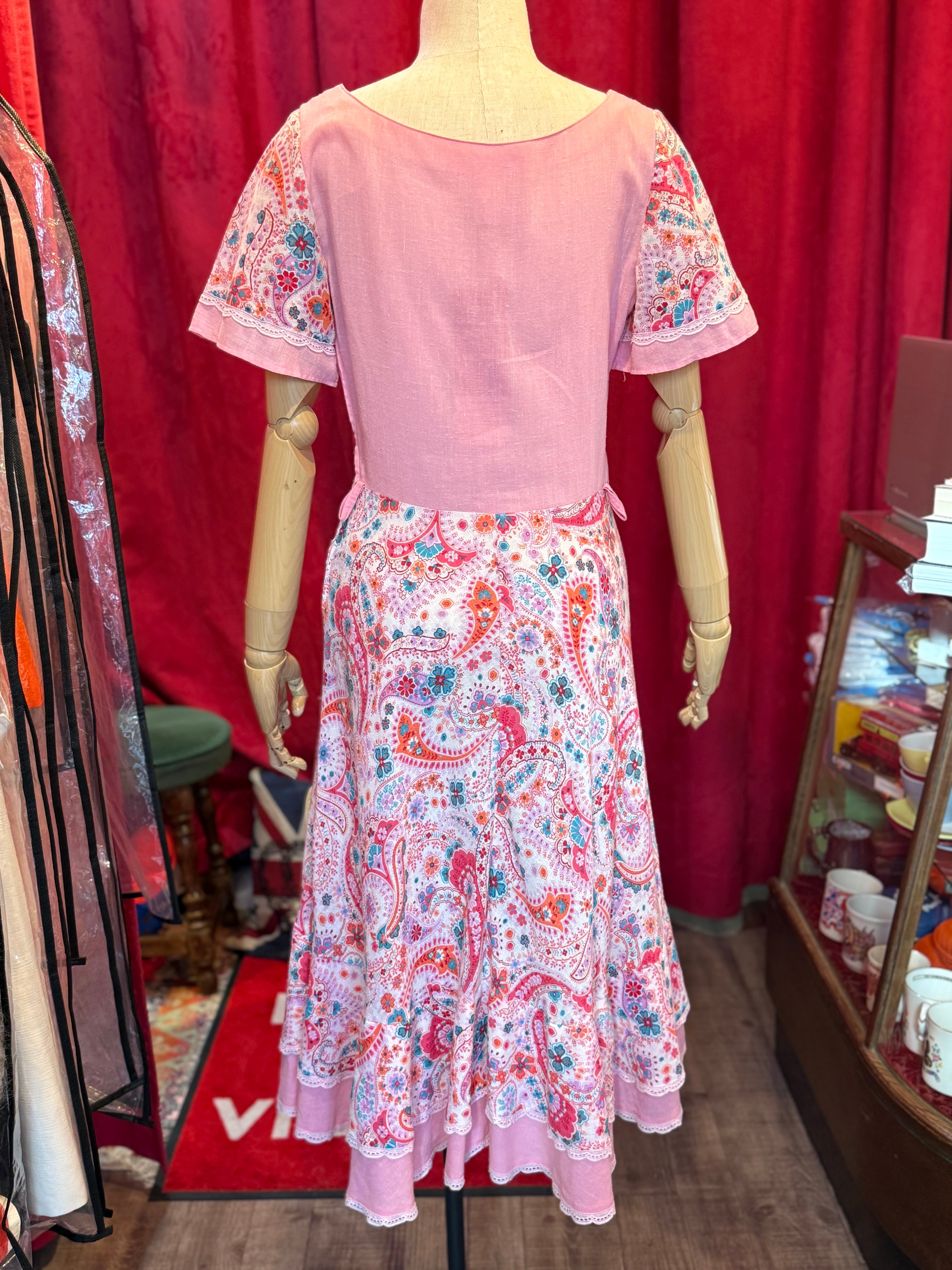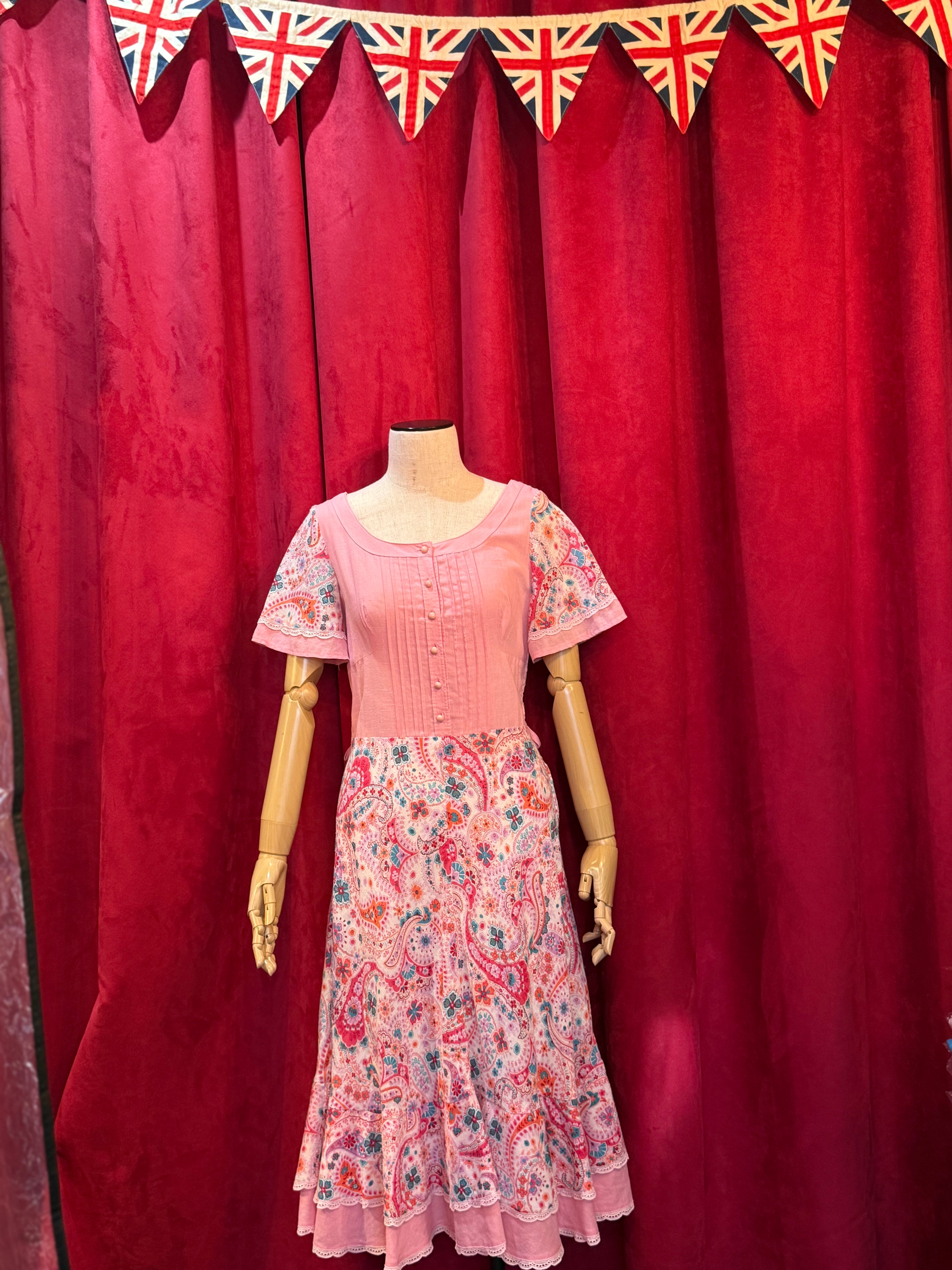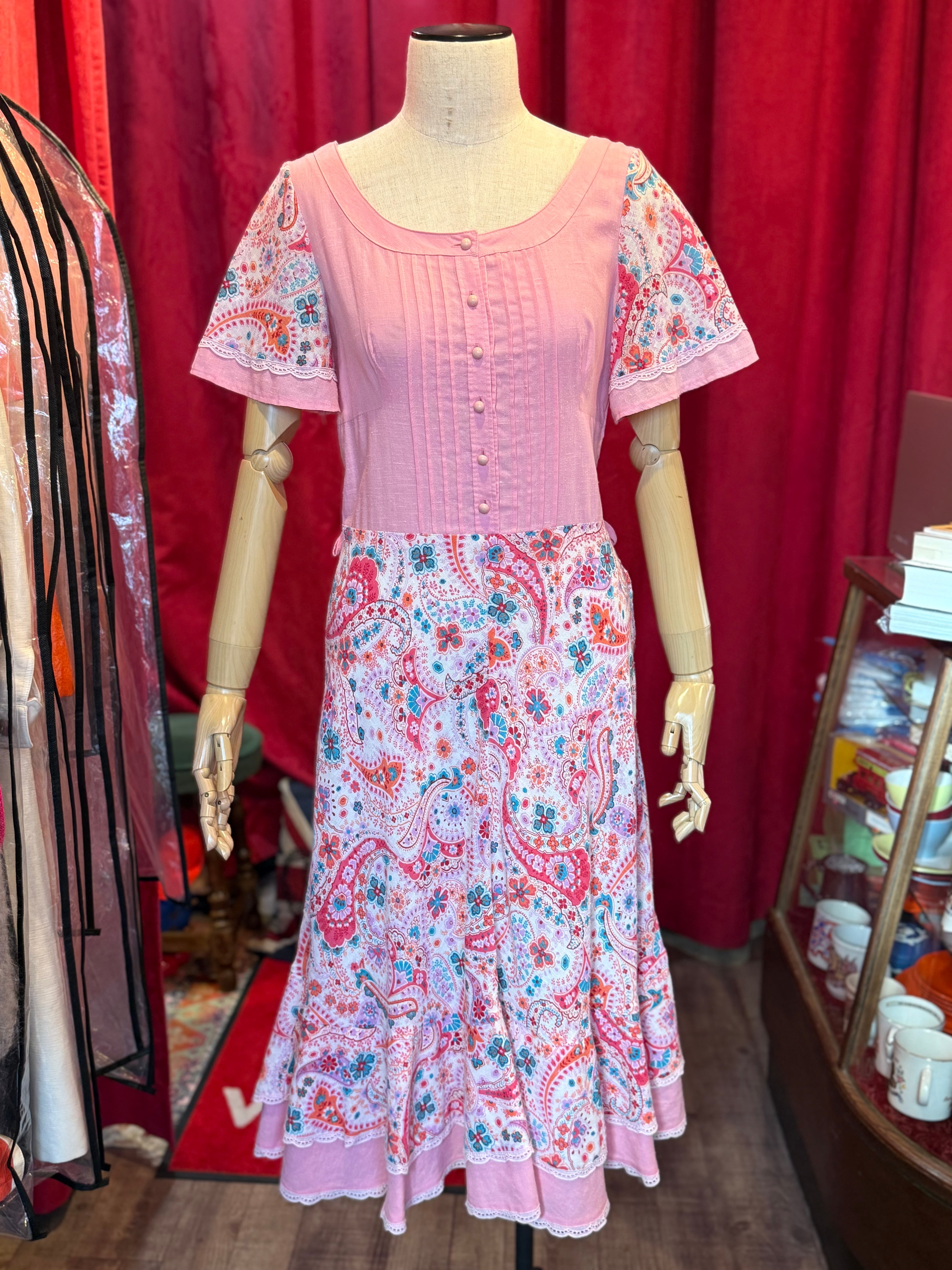 ペイズリーとお花柄が合わさった70’sを感じる素敵なデザイン。ウエスト部分にジッパー、ベルトを通す事も可能。スカート部分には白い裏地が付いております。