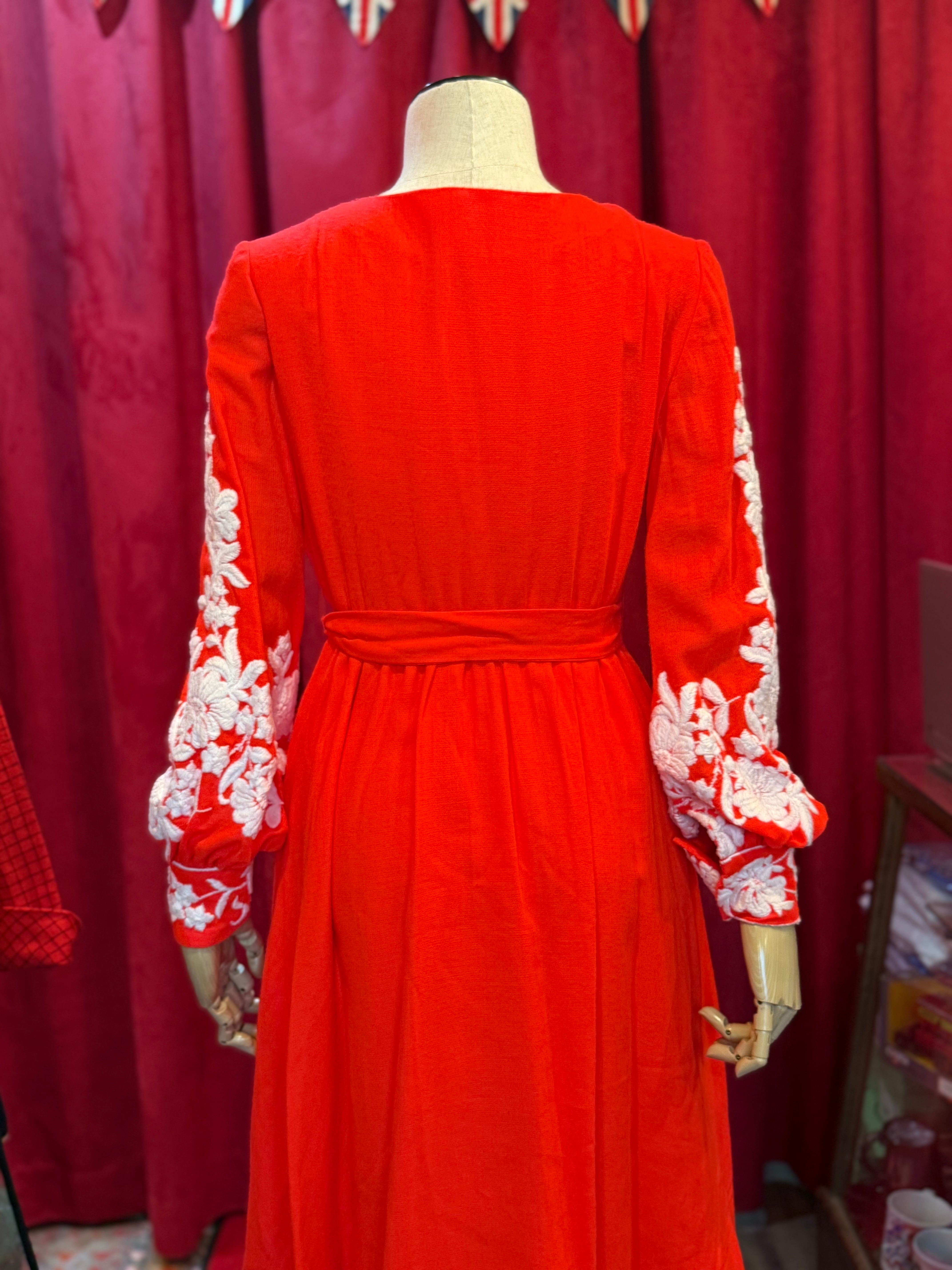 美しい赤いドレスに腕部分には刺繍が施されております。それは美しく、上品でアートの様です。ウエストには取り外し可能なベルト代わりのリボン付き。非常に良い状態です。ですがヴィンテージ品になりますのでご理解の上ご購入お願い致します。こちらの商品はクリーニング済です。