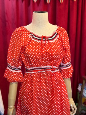 赤いドット柄に70’sスタイルのデザイン、丈が長めのワンピースです。ウエスト部分はゴムになっているので楽ちん♪状態は非常に良いですがヴィンテージ品となりますのでご理解の上ご購入お願い致します。クリーニング済です。