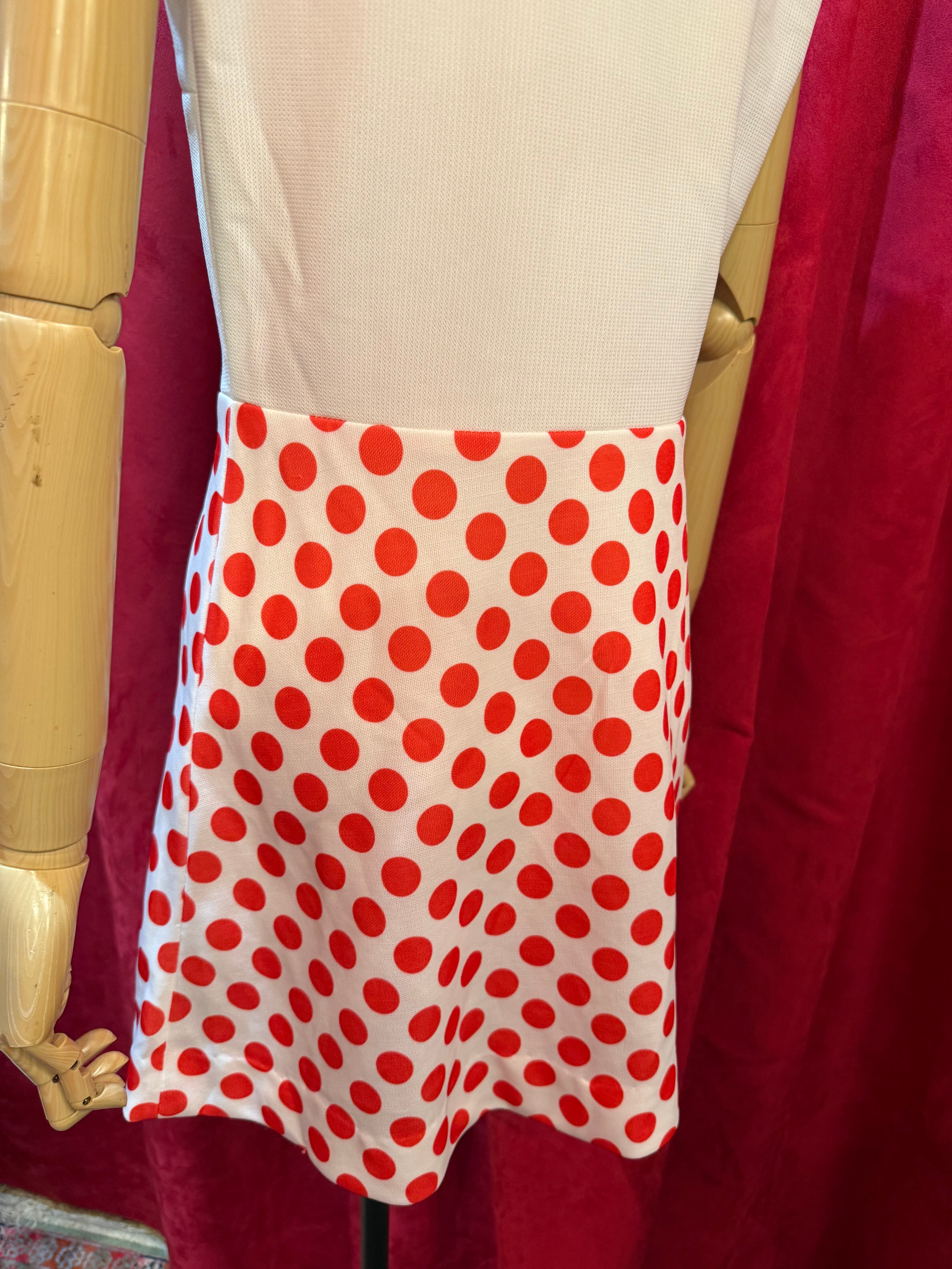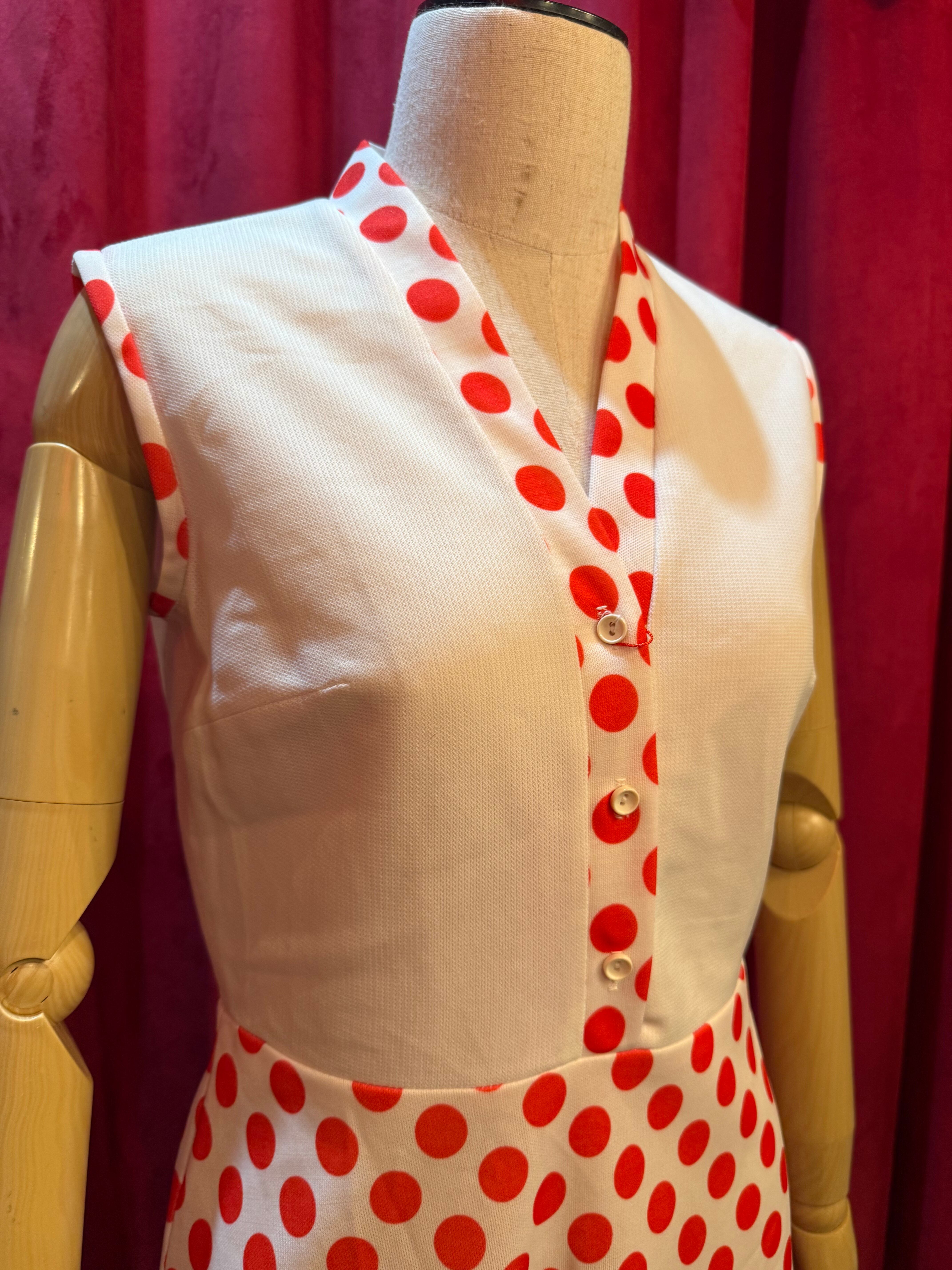 赤いドット柄が可愛いノースリーブミニワンピース。ジャージ生地なので、軽く夏も涼しく着ていただけます。お洗濯も簡単!60’sらしい1枚。