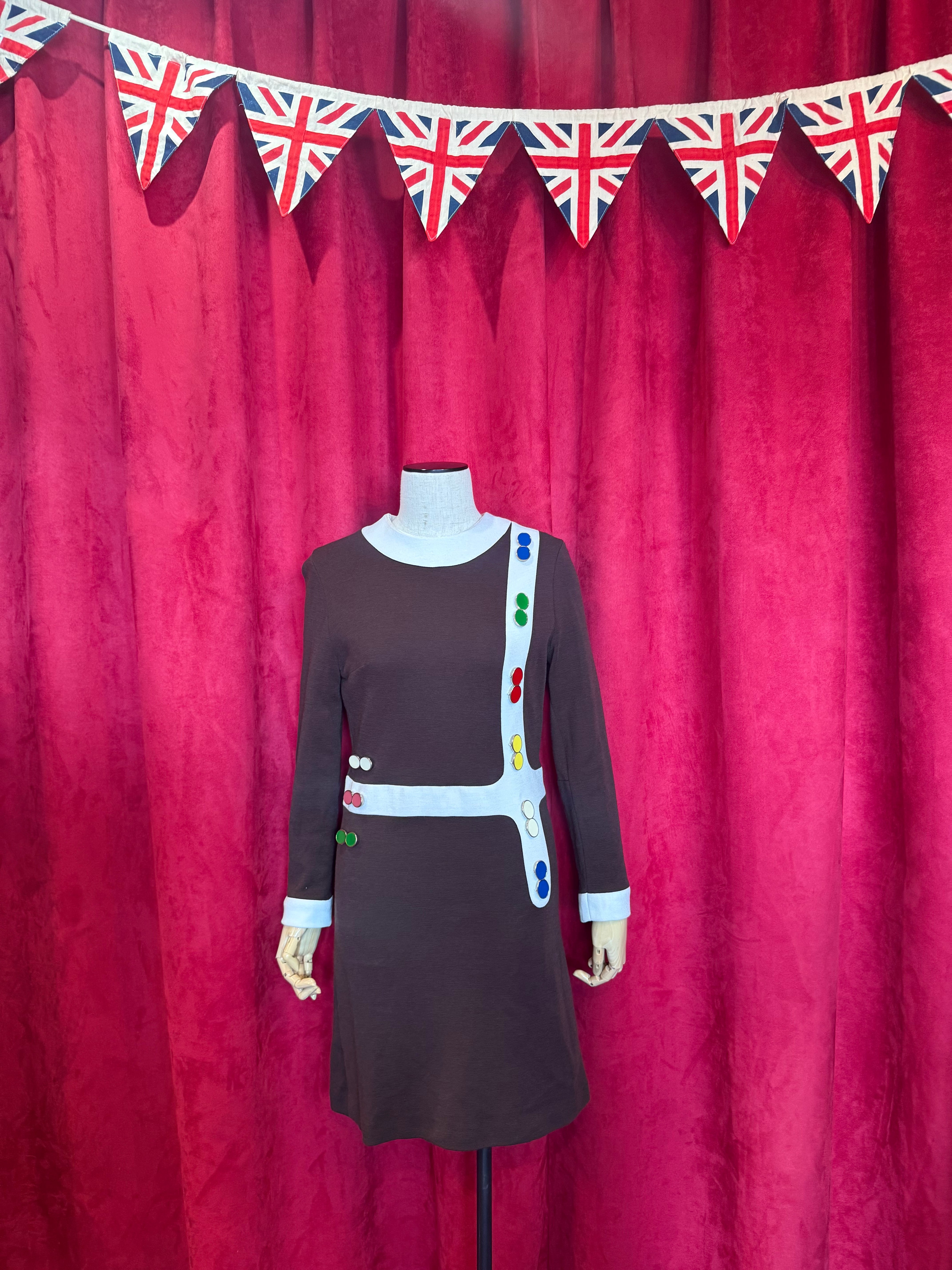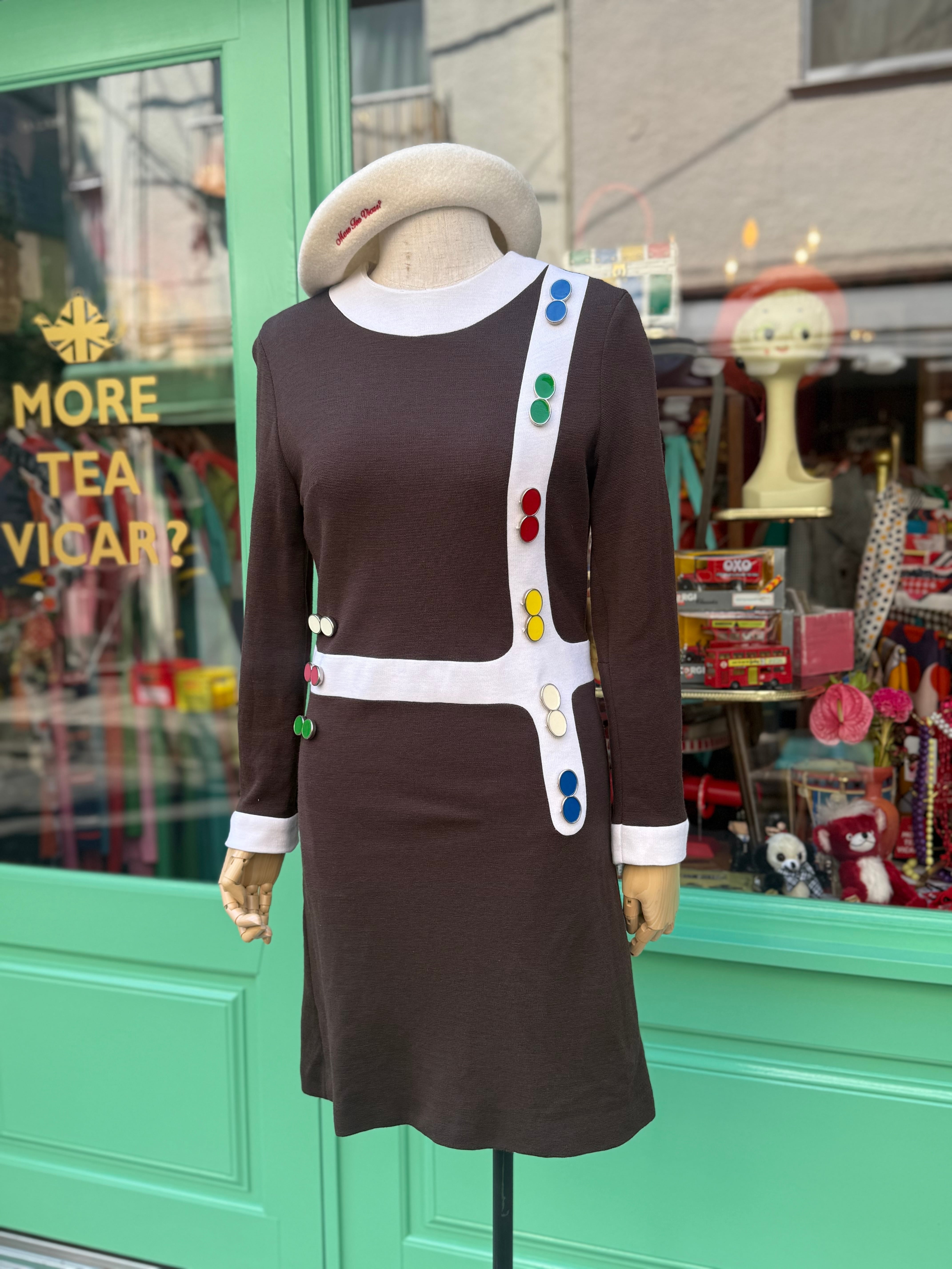 他にはなかなか出てこない、希少な一点もの。フロントの特徴的な装飾と、このワンピースのために選ばれたような可愛らしいボタンが印象的で、コーディネートの主役になる一着です。白の裏地付きで、しっかりと仕立てられた丁寧な作り。タグはありませんが、特別にオーダーされた一点ものの可能性が高く、ウール混と思われる厚手のしっかりとした生地が使用されています。60年代らしい雰囲気がありつつ、モダンなスタイリングにも映える、ヴィンテージファン必見のワンピースです。