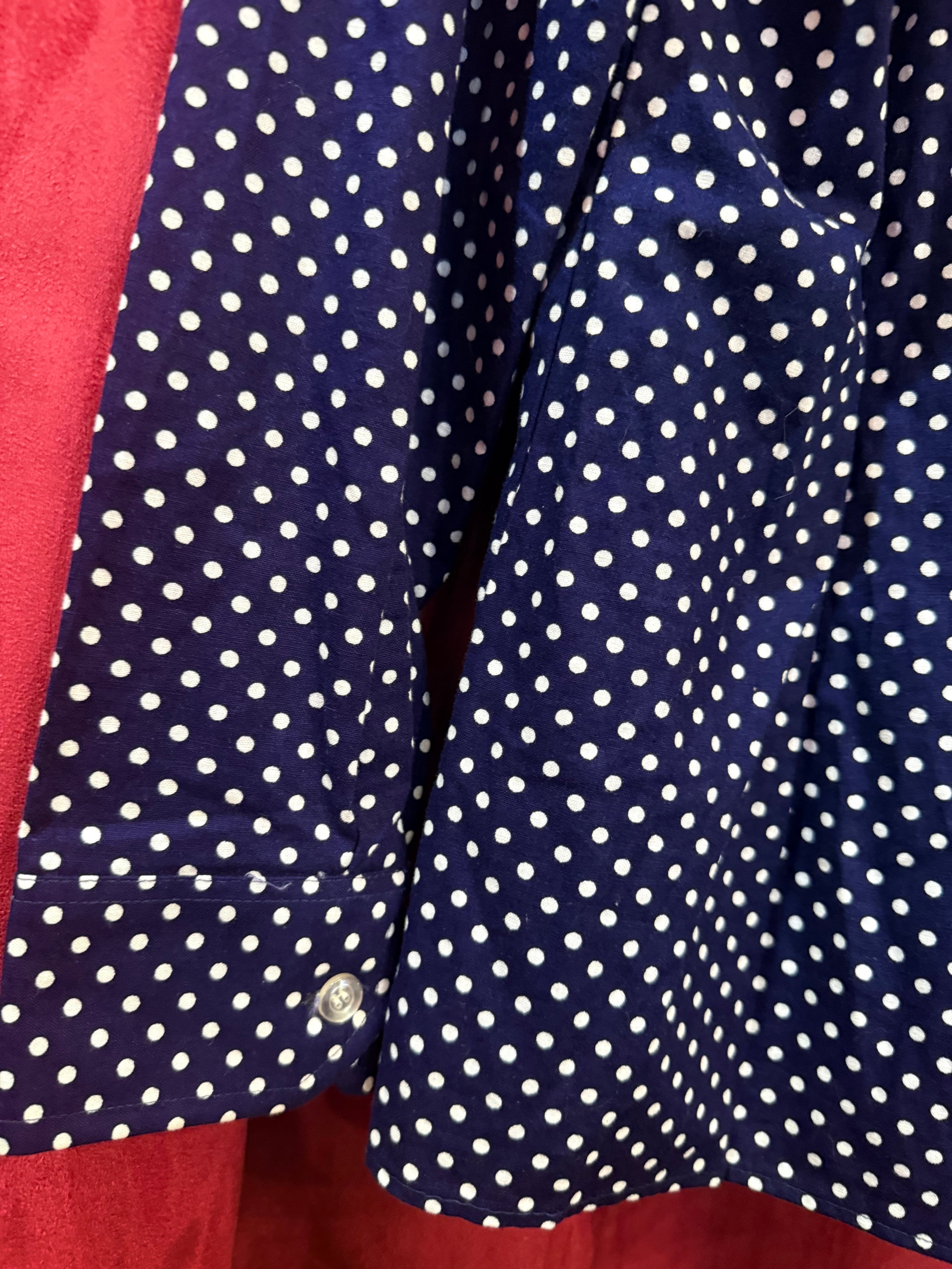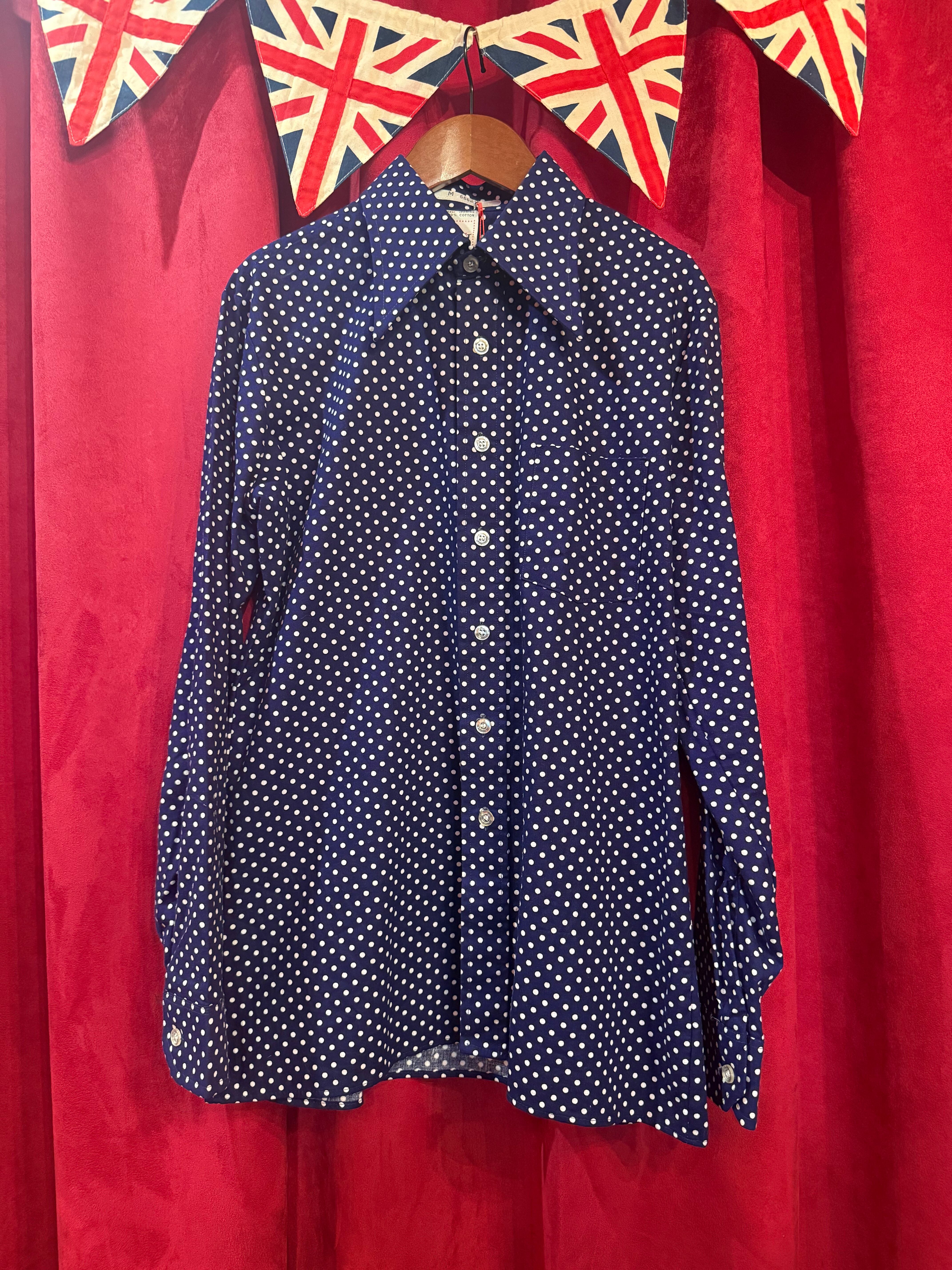 イギリスで買い付けた、70年代ヴィンテージのメンズシャツです。ネイビーベースにドット柄が映える、レトロな雰囲気の一着です。シンプルながらも存在感があり、派手めのネクタイやバッジなどの小物とも好相性。個性的なスタイリングを楽しみたい方におすすめです。