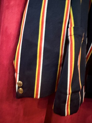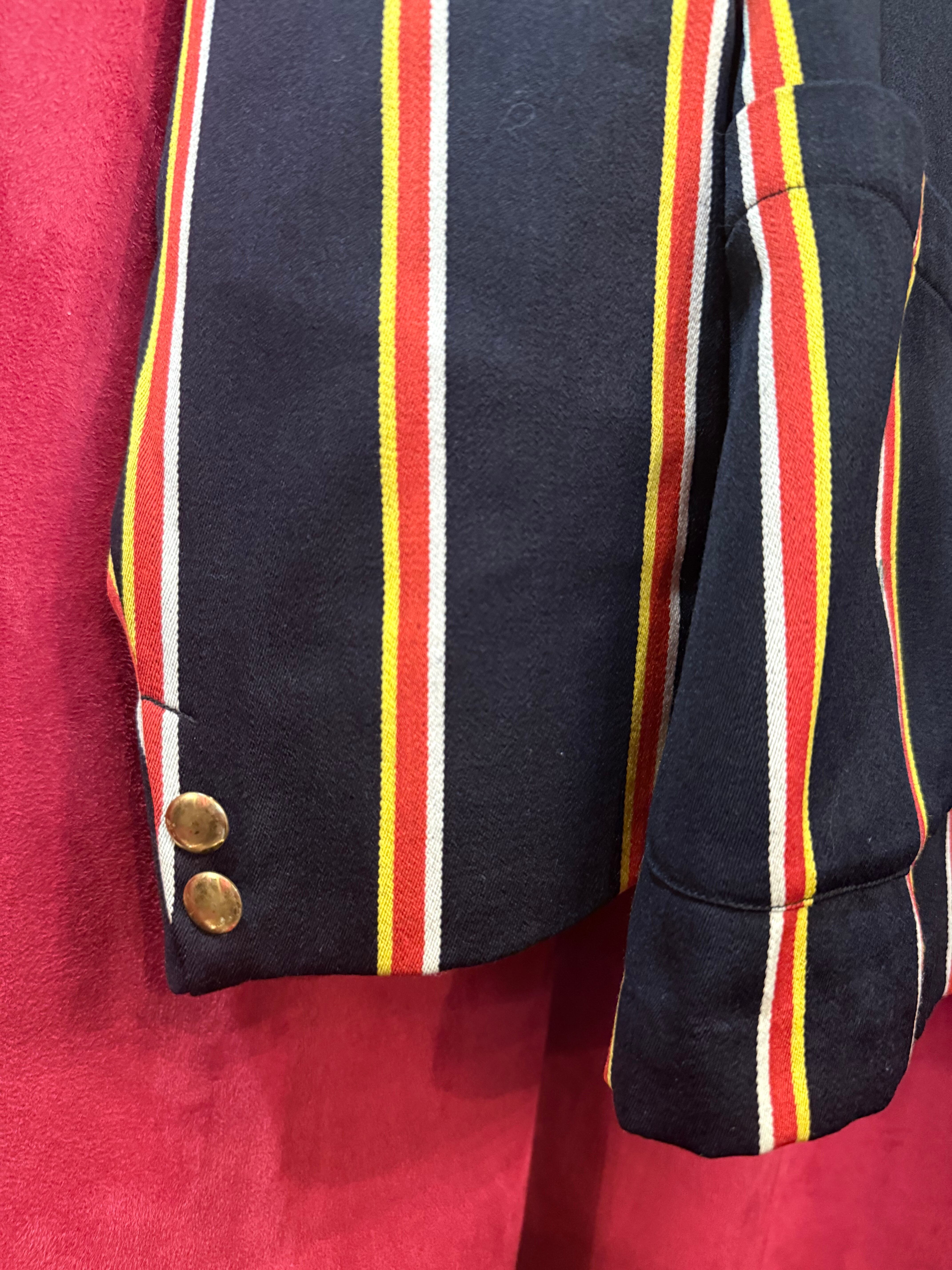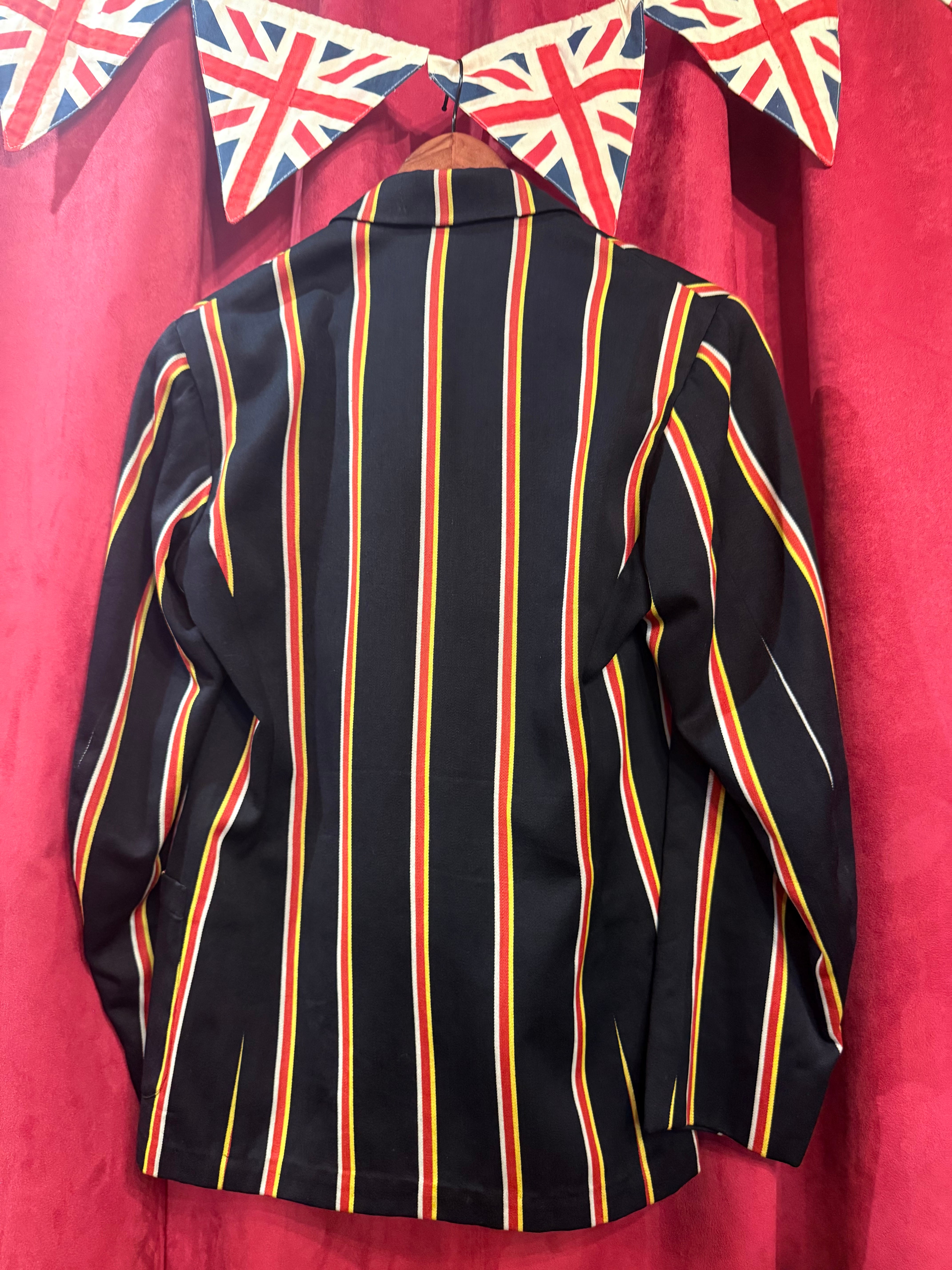ブラック地に赤・白・黄色のストライプが映える、クラシックで印象的な一着です。