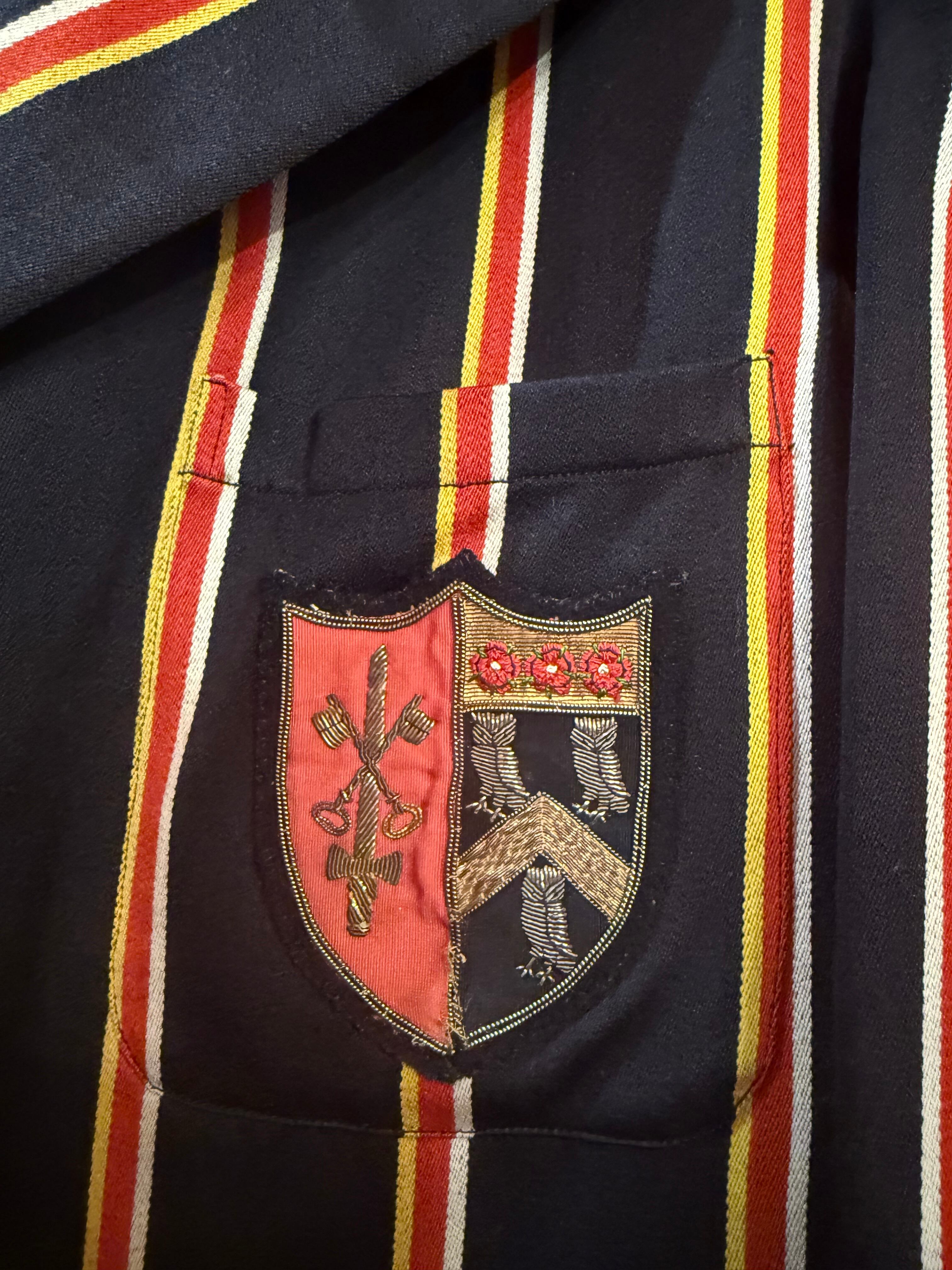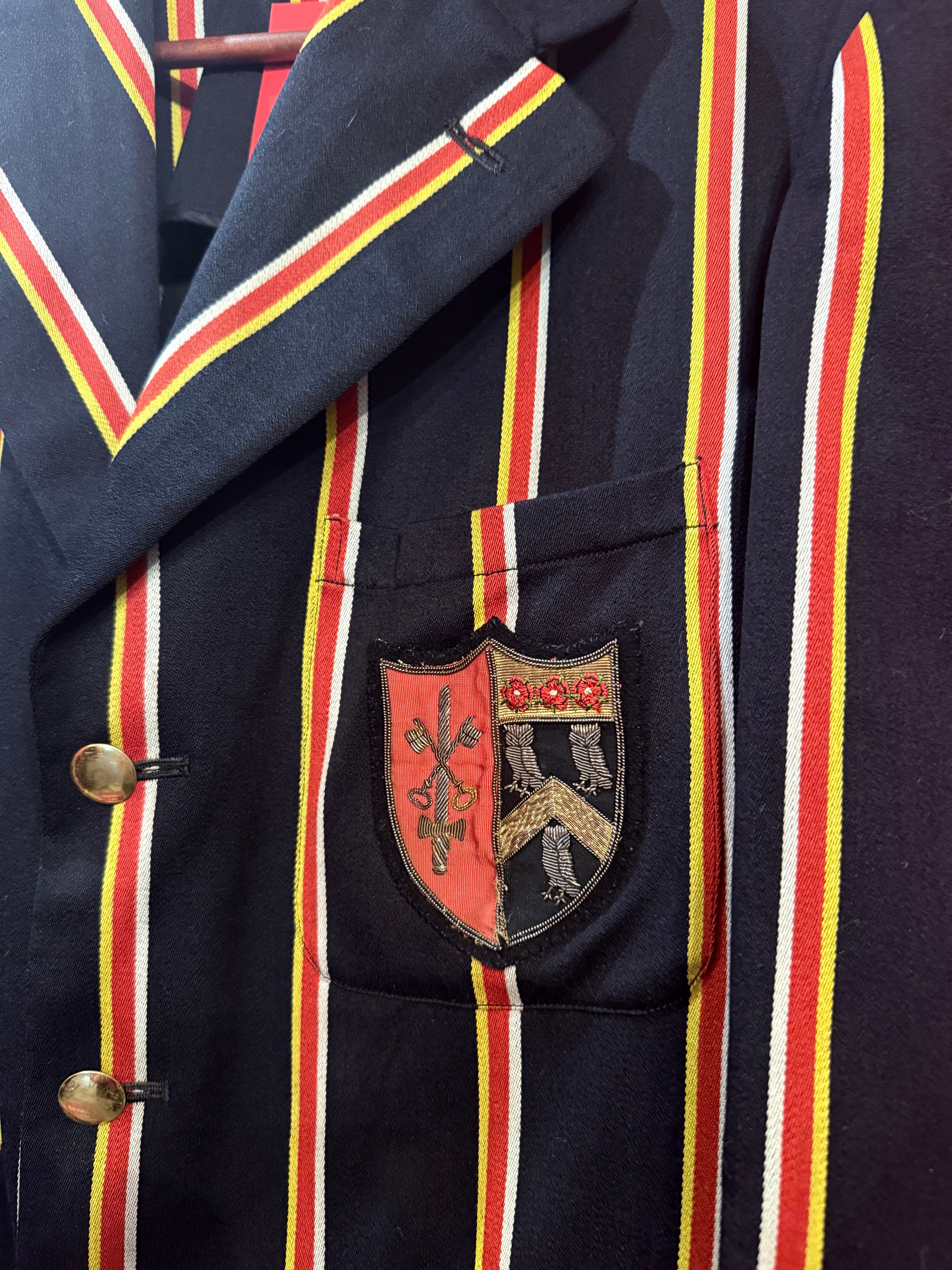 胸元のエンブレムは、刺繍と細い金属線のような素材で丁寧に作られており、ヴィンテージならではの重厚感と美しさがあります。時代を超えて愛される、存在感のあるジャケットです。