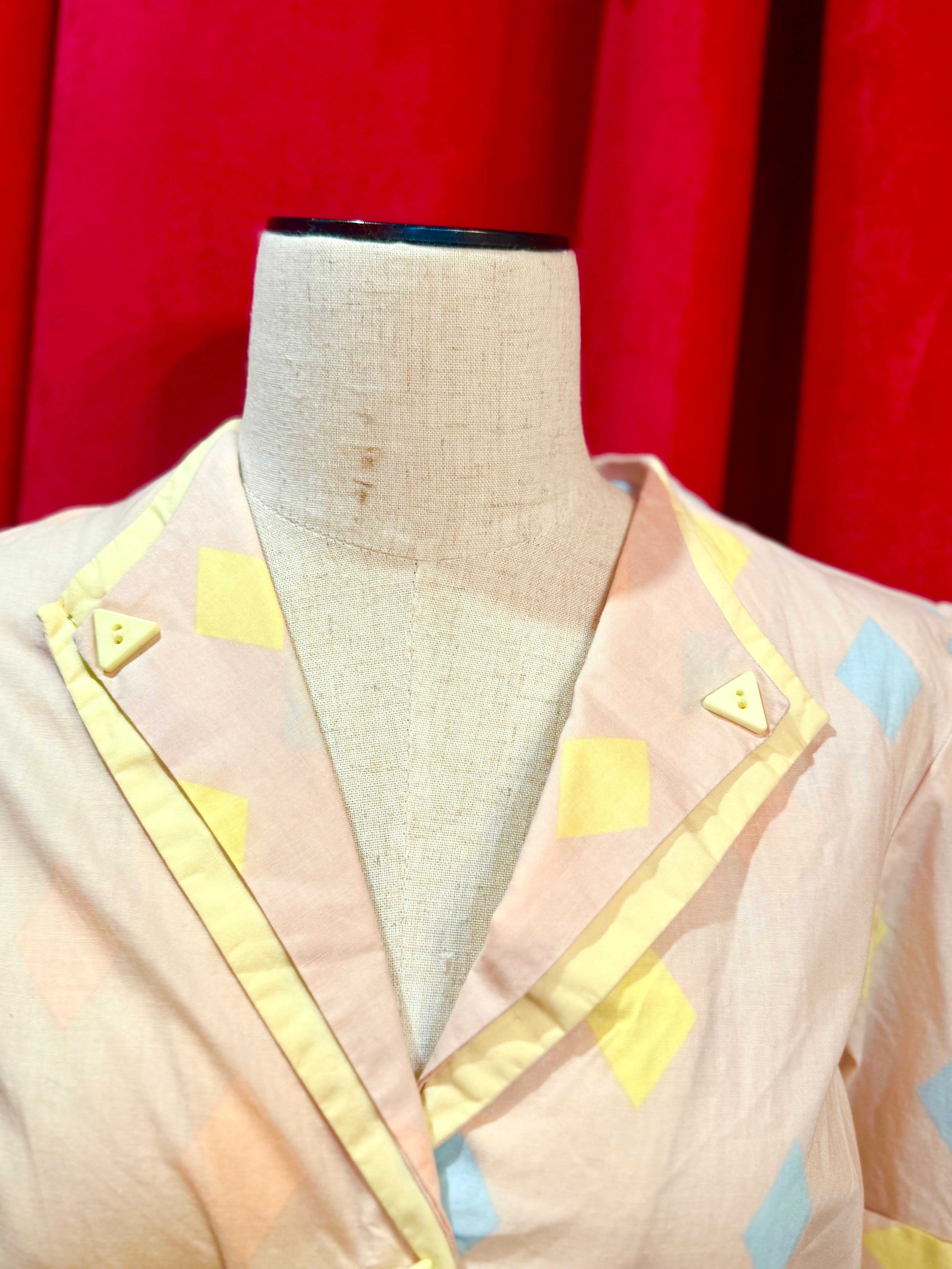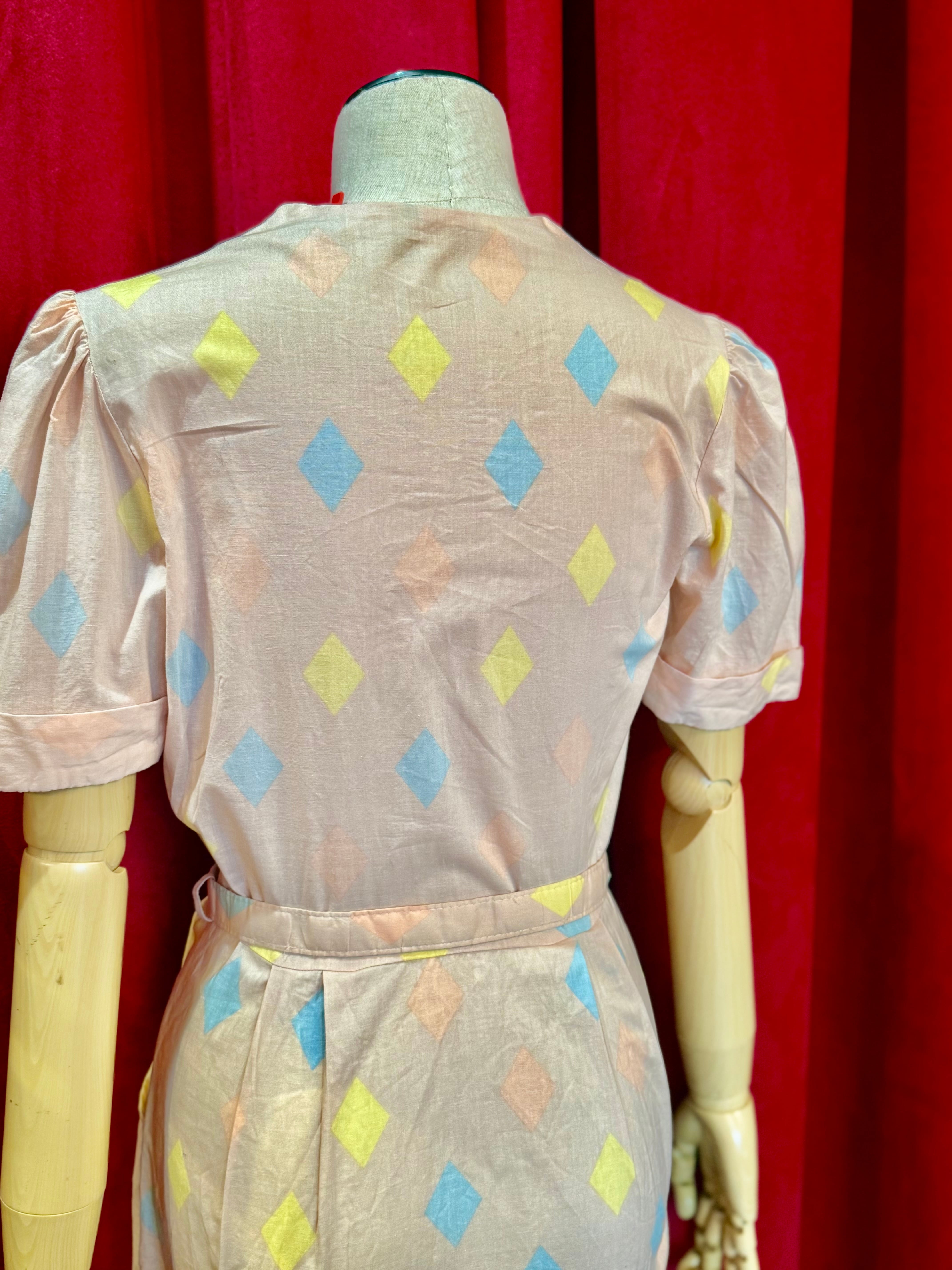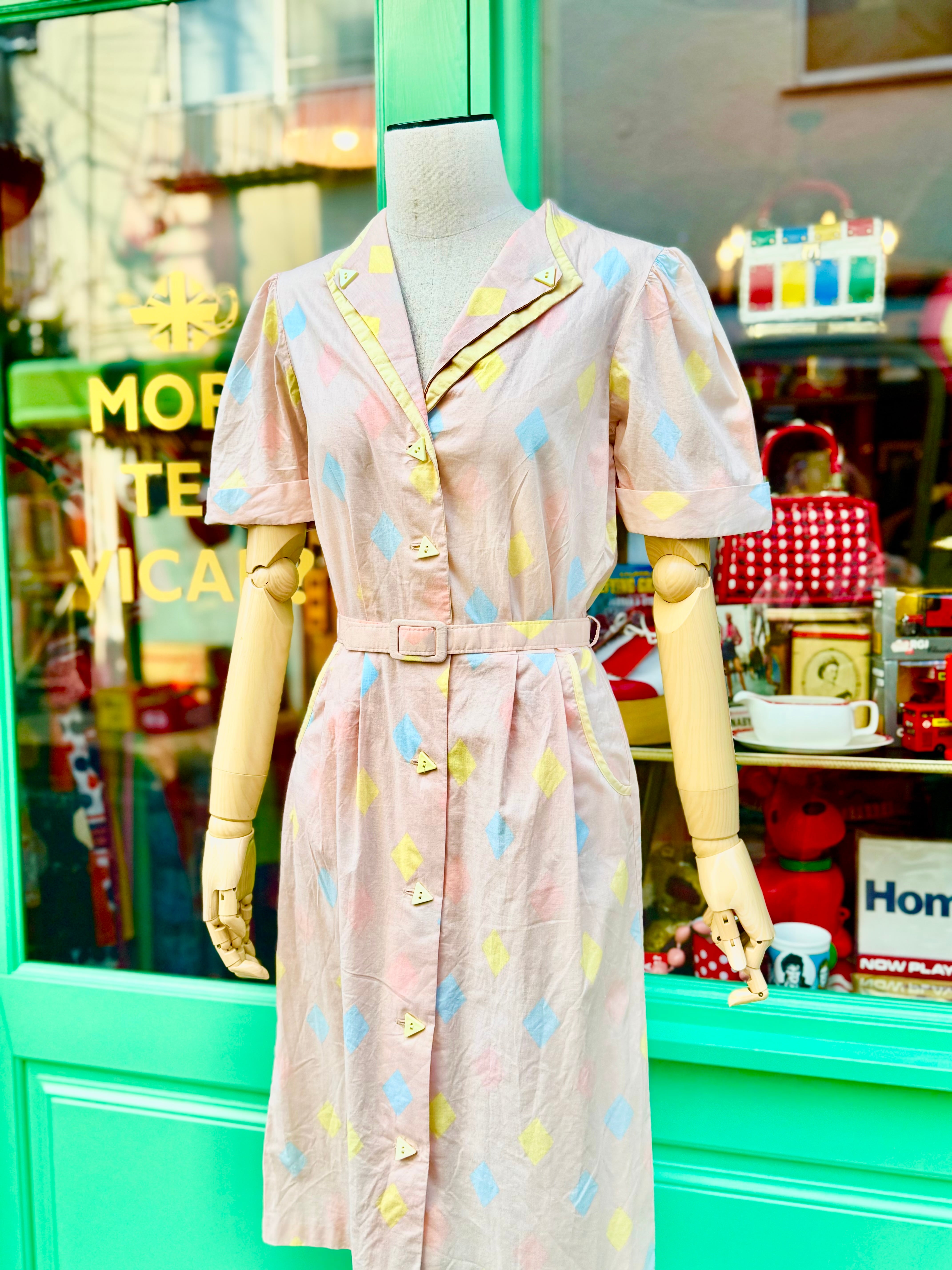 イギリスより買い付けました、70’sのヴィンテージワンピースになります。ベビーピンクをベースにダイヤ柄が入ったデザインに、三角ボタン。ベルトも付いております。普段XS~Sを着用されている方にオススメです。