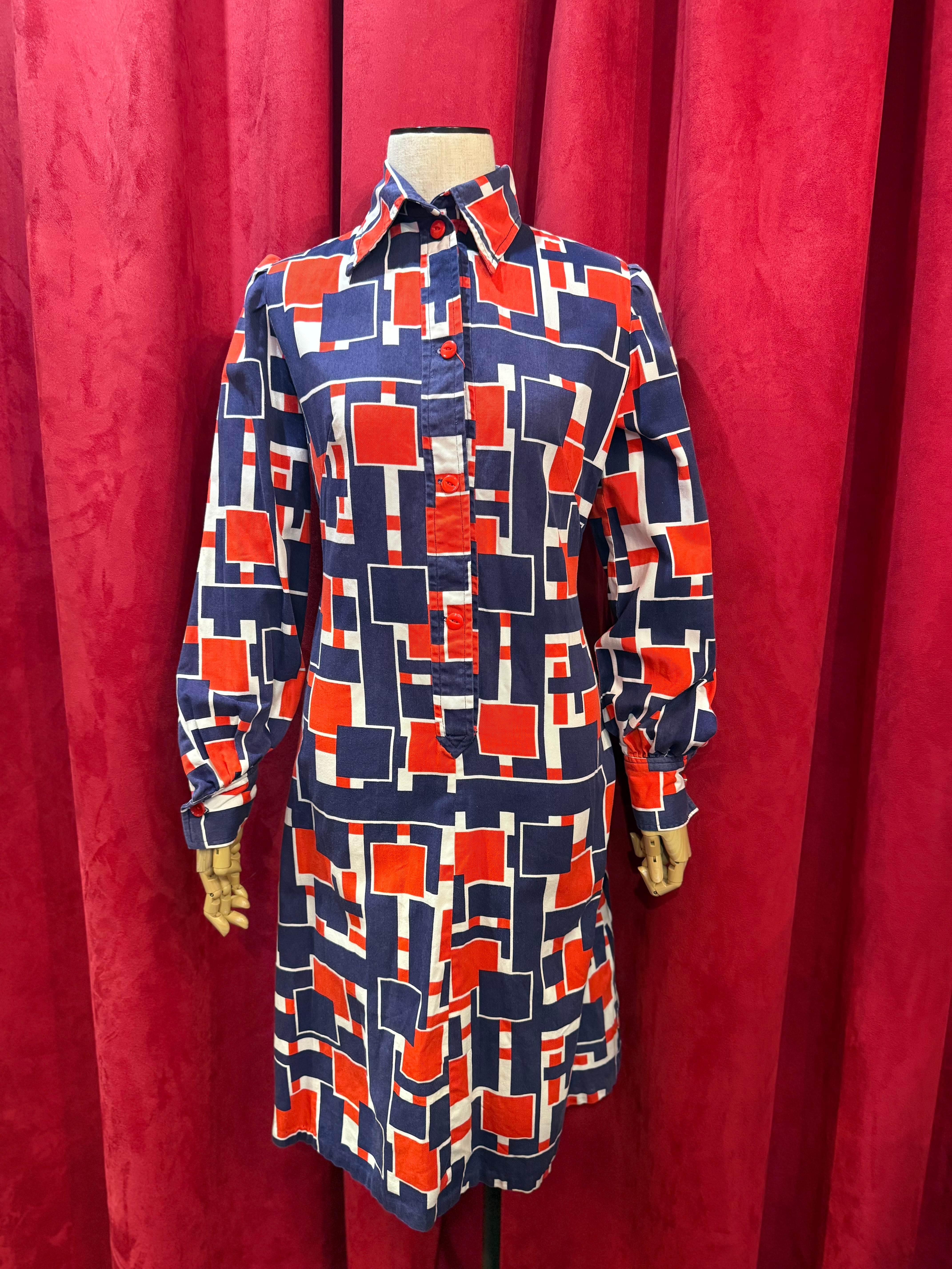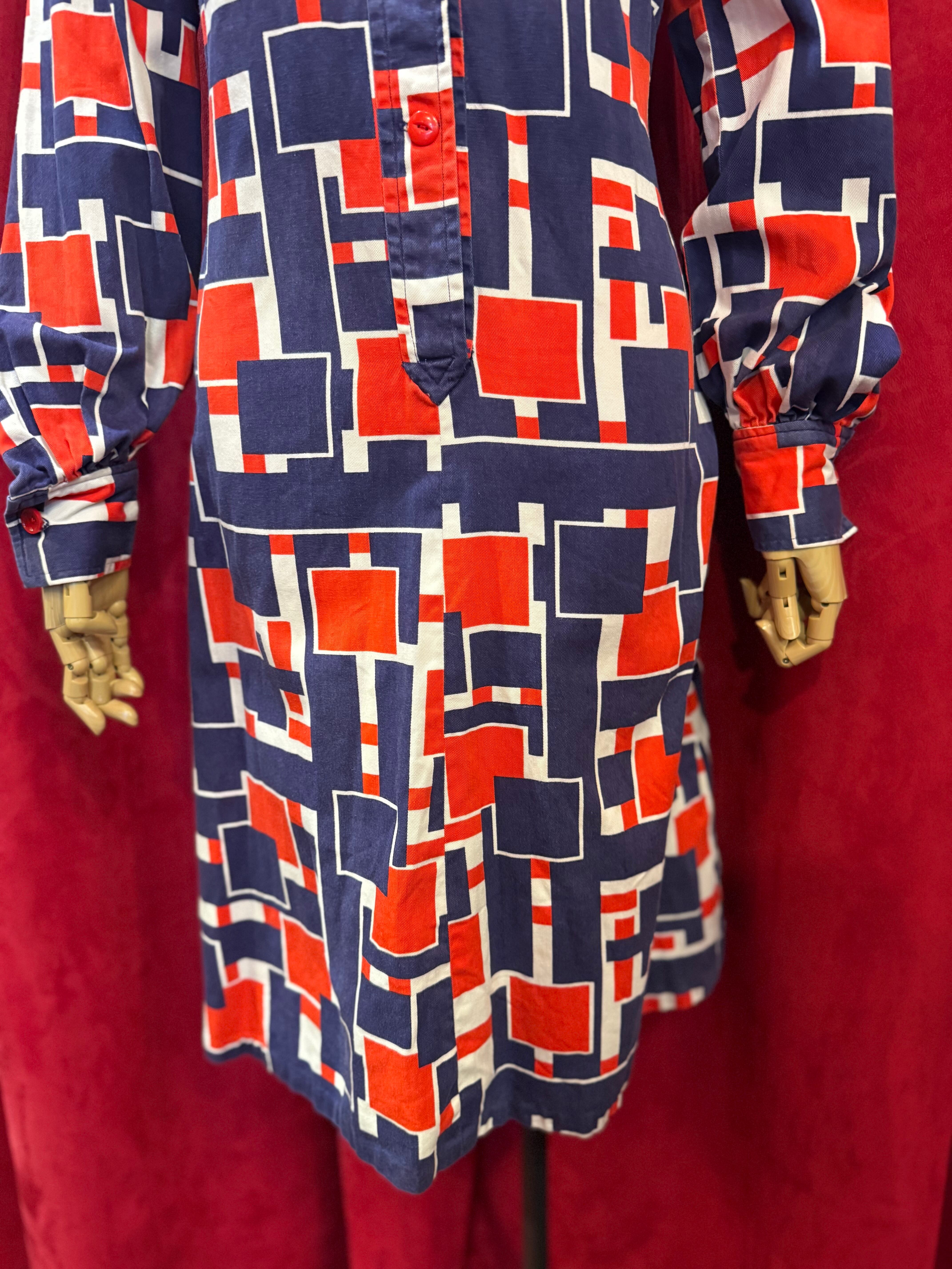 大胆で印象的なモンドリアン風デザインに、レッド・ホワイト・ネイビーのトリコロールカラーが映える一着。フロントにはアクセントとして4つのボタンが施されております。