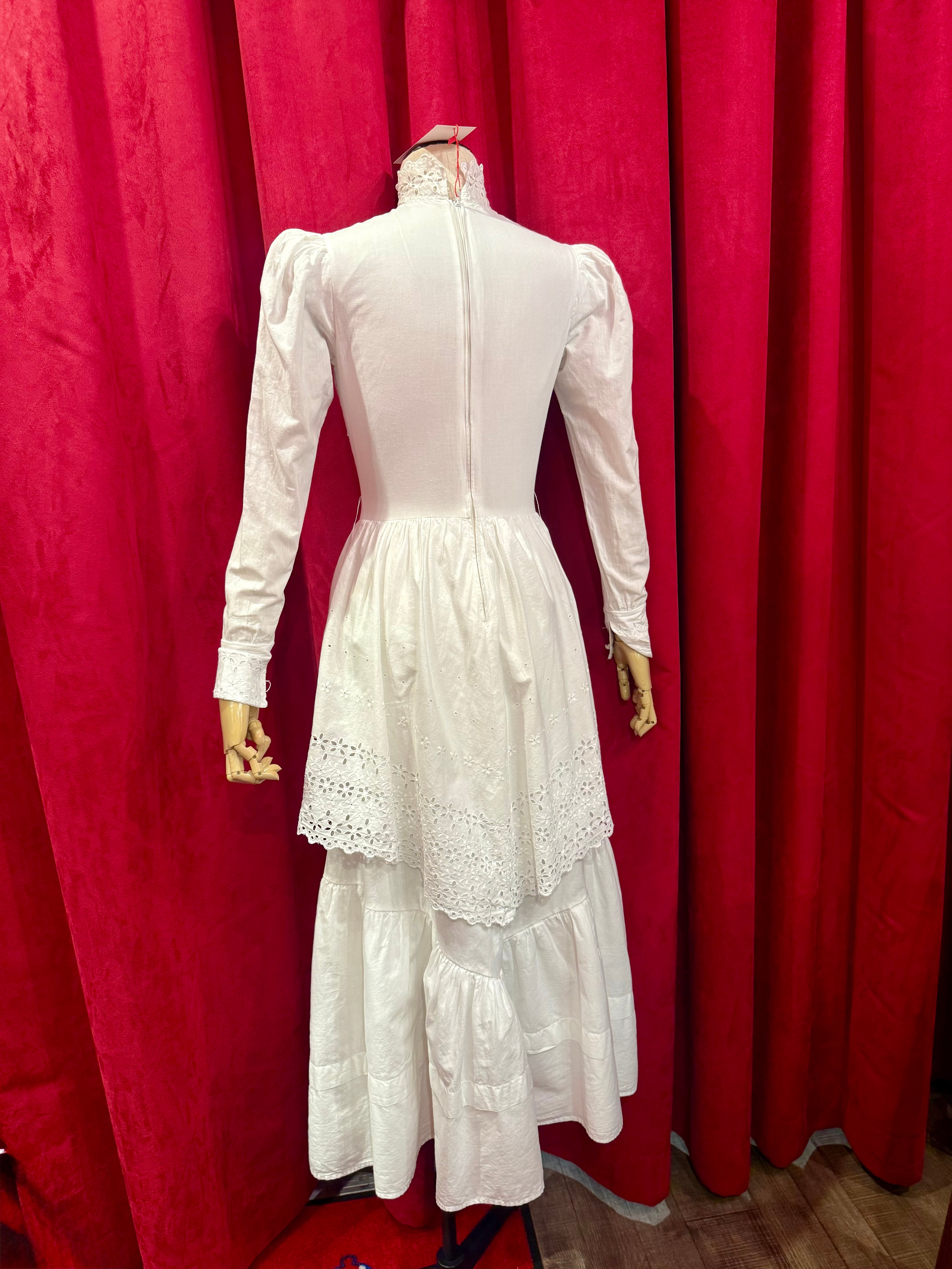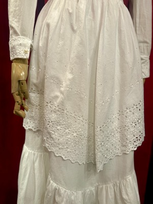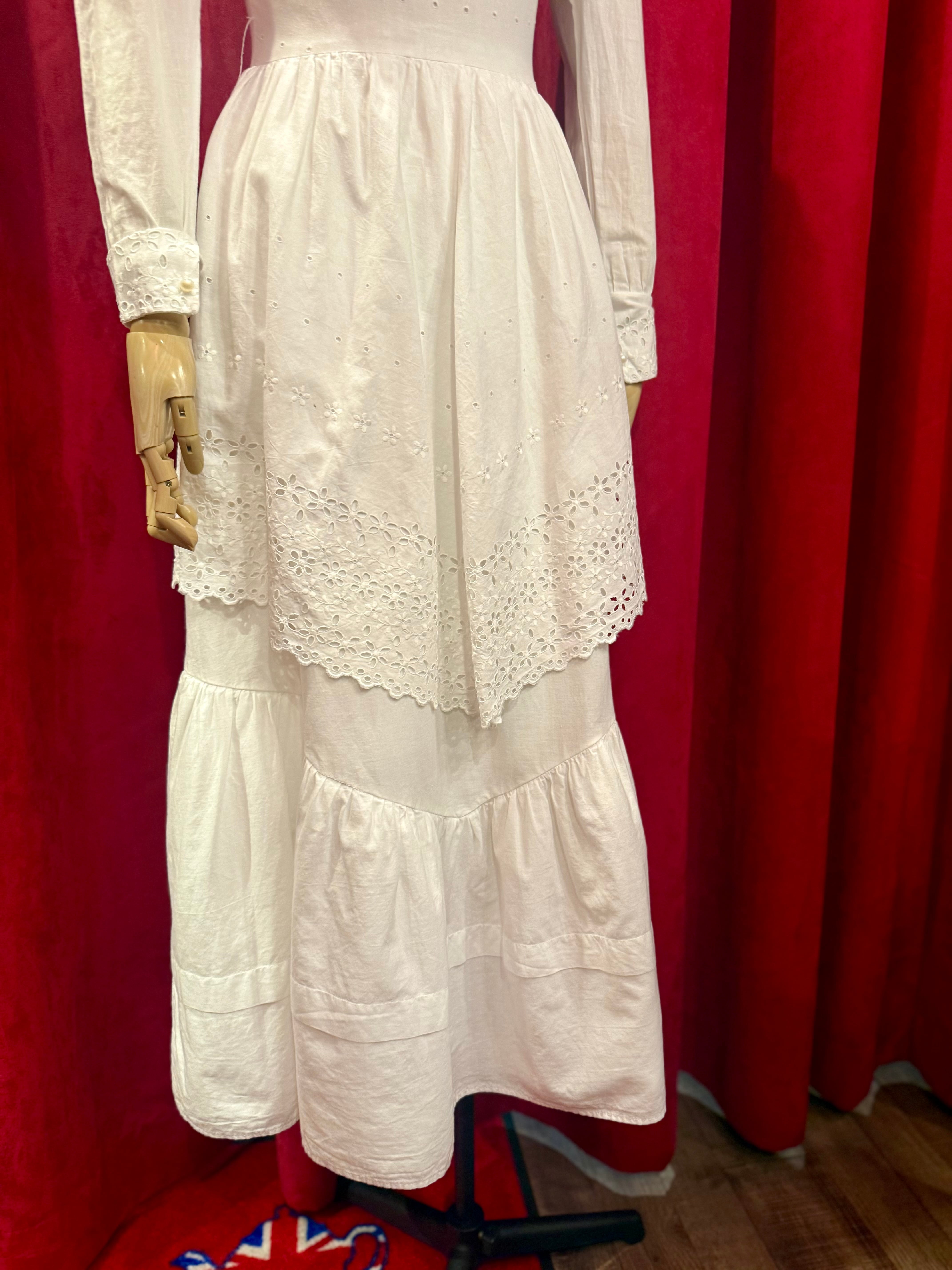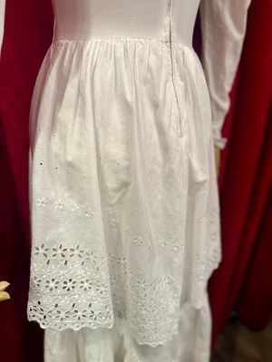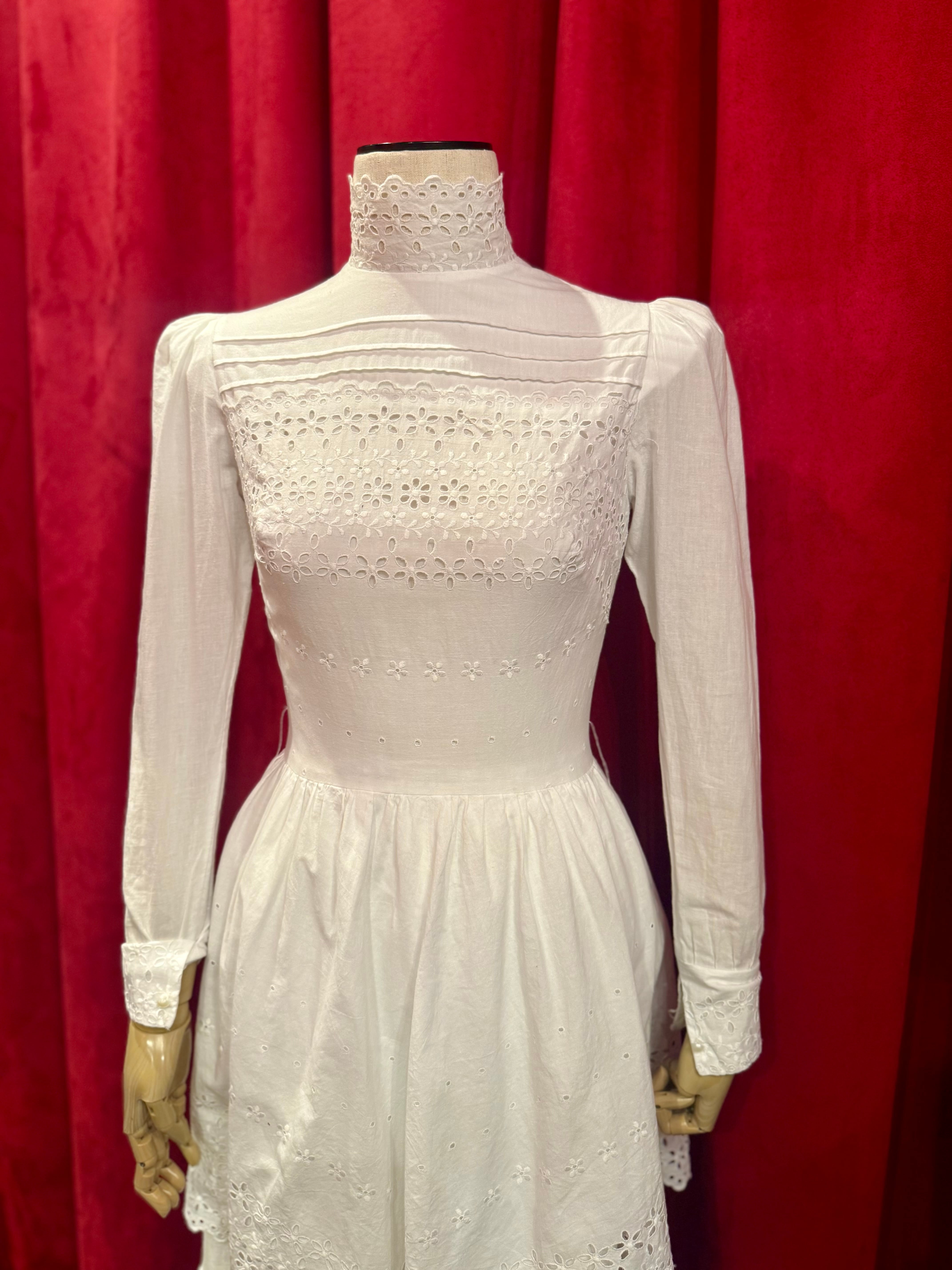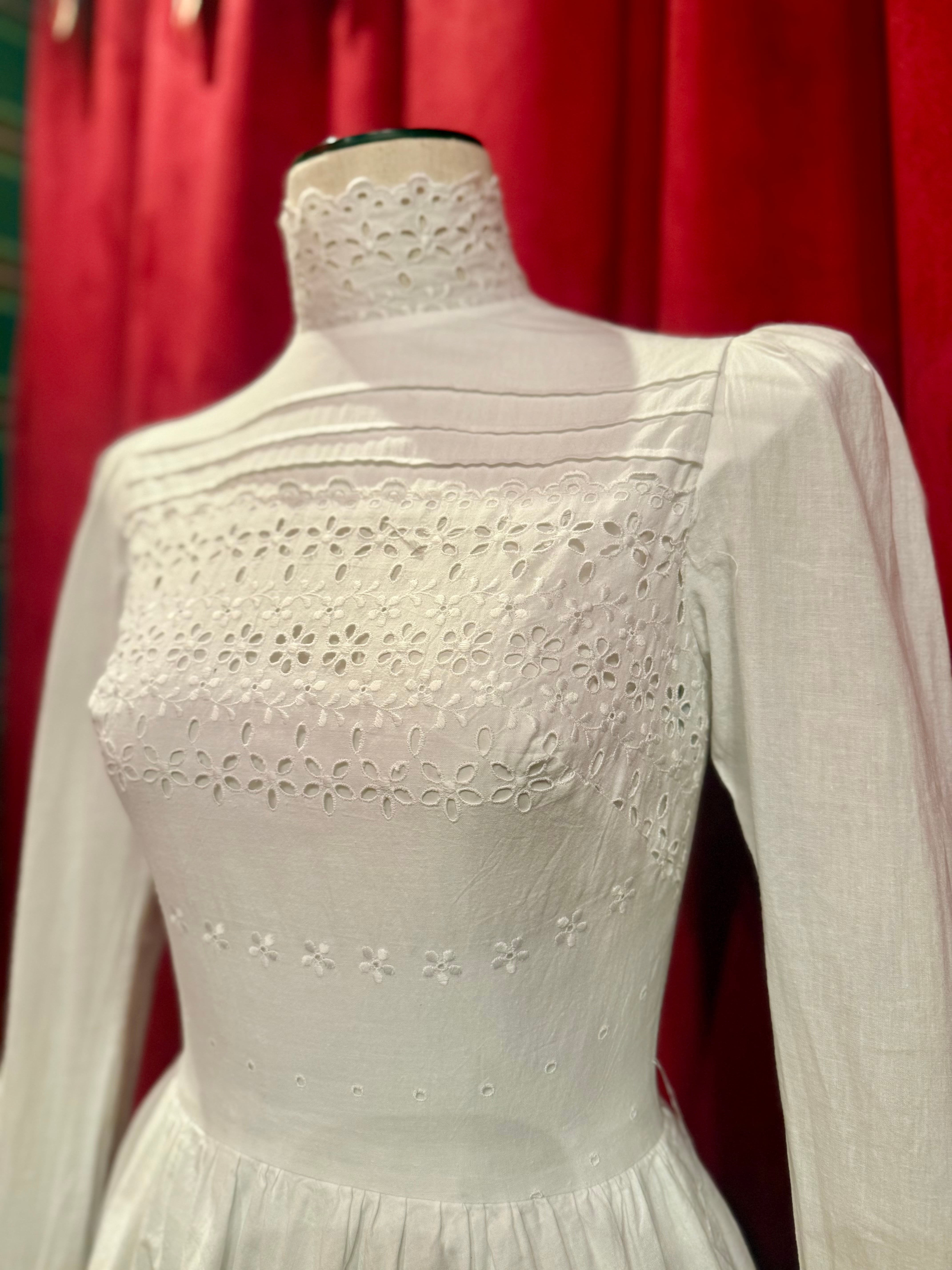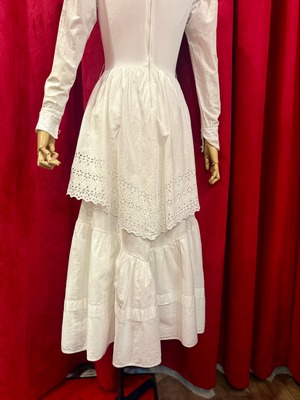 真っ白な美しいロングワンピース。コットンレースはとても上品でシルエットも綺麗です。ベルトを付けれるので、小物をアクセントに。スカーフとの相性もよく、涼しい季節に大活躍してくれる1着。