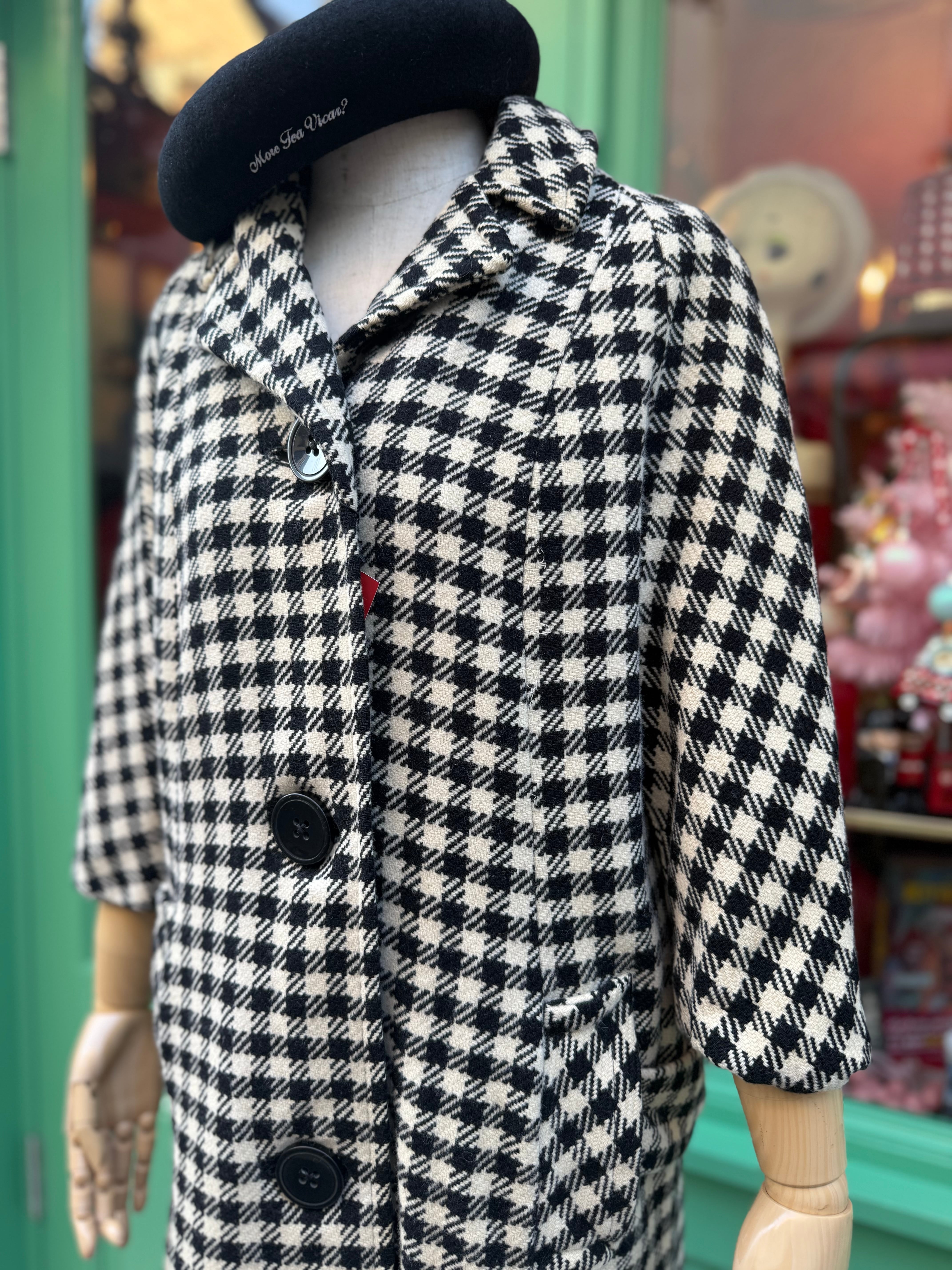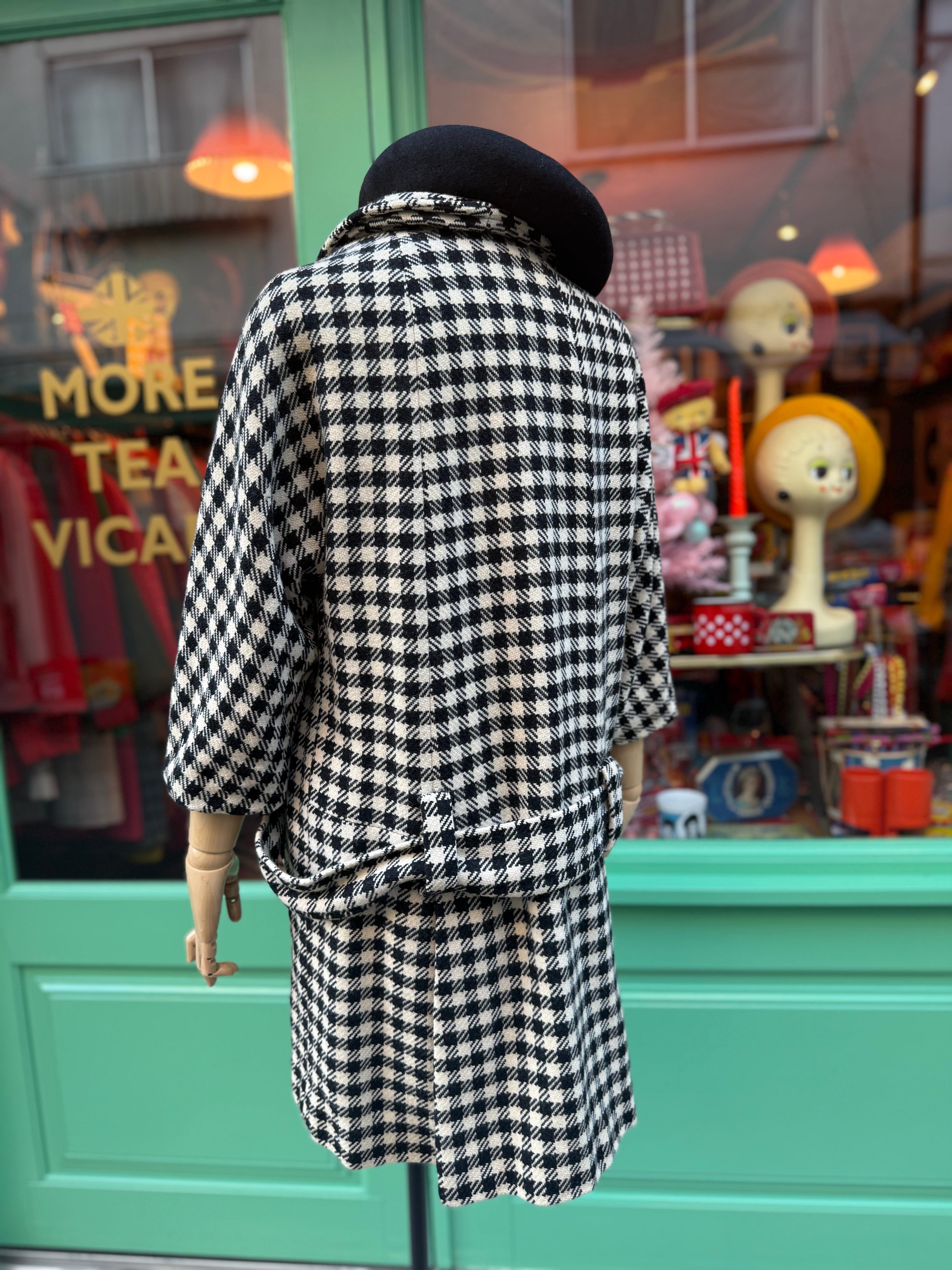 モノトーンのギンガムチェックコートになります。フロントの大きな3つのボタンが特徴。
