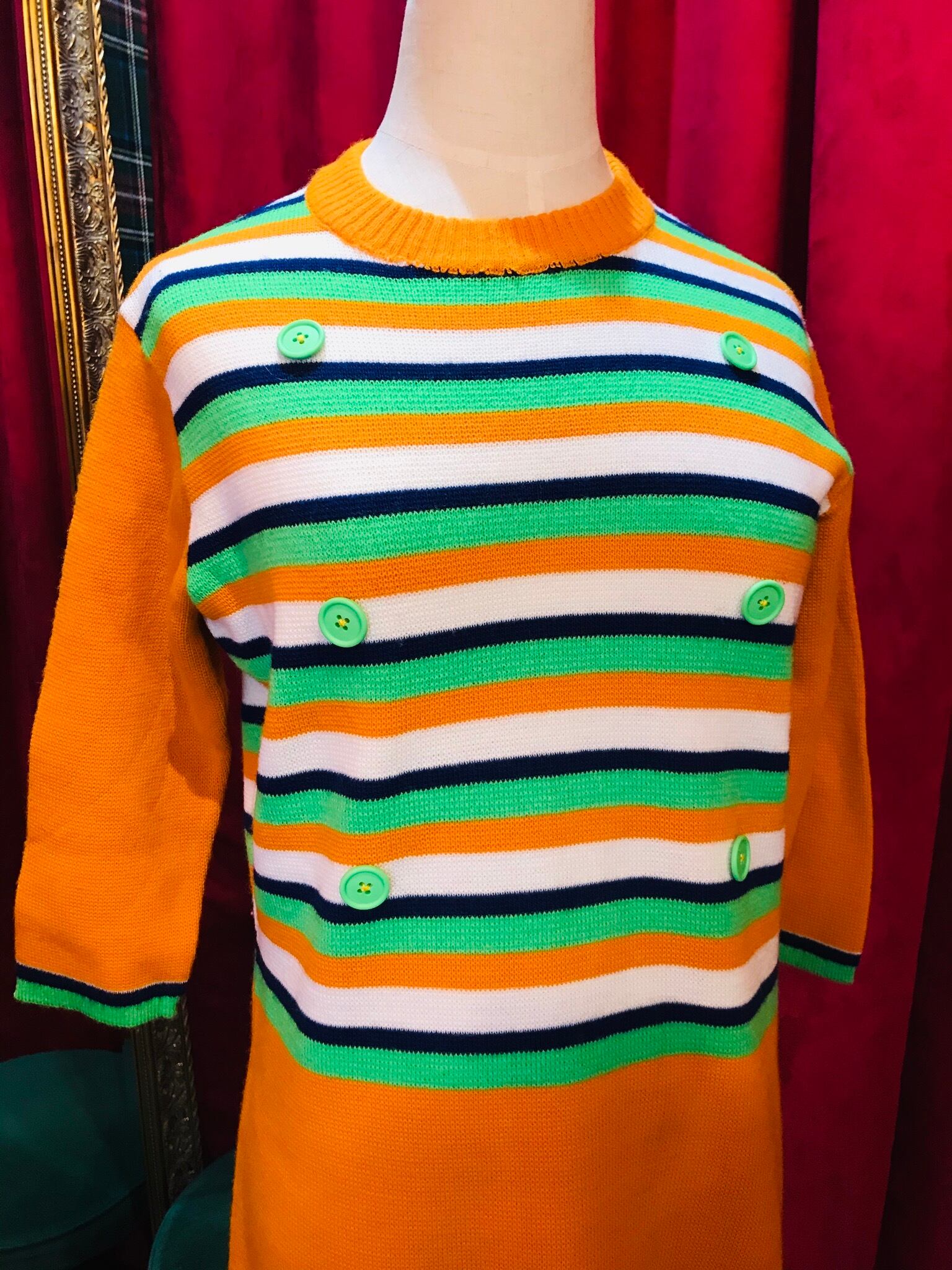 しっかりしたニットで着心地も抜群◎グリーン、イエロー、ホワイトのボーダーが60年代らしいポップなデザイン♡フロントのボタンはお洋服に合わせてイタリア製の新品のグリーンのボタンに付かけえております♪お洋服のポイントになっておりお洋服を引き立ててくれています♡タイツやベレー帽、小物と合わせても☆裏地はございませんが特に透け感などございません。クリーニング済になります。状態は非常に良いですが多少箇所によっては毛羽立ちを感じる方もいらっしゃるかもしれません。ヴィンテージの味ですのでご理解の上ご購入お願い致します。