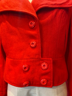 60’sらしいフロントのスペイシーなデザイン!大きく丸みのある襟、現代には無い美しいボタンが素晴らしいく、当時のファッション誌や映画のコスチュームのようなとても貴重なジャケットです。ウールでとても温かく生地もしっかりしており、裏地も付いております。タートルネックやブラウスはもちろん、アクセサリーとの相性抜群!ワンピースやスカートに合わせていただいても、パンツスタイルにも♡60’sファッション好きにはたまらないジャケットです!!状態は非常に良くクリーニング済です。ヴィンテージ品となりますのでご理解の上ご購入お願い致します。