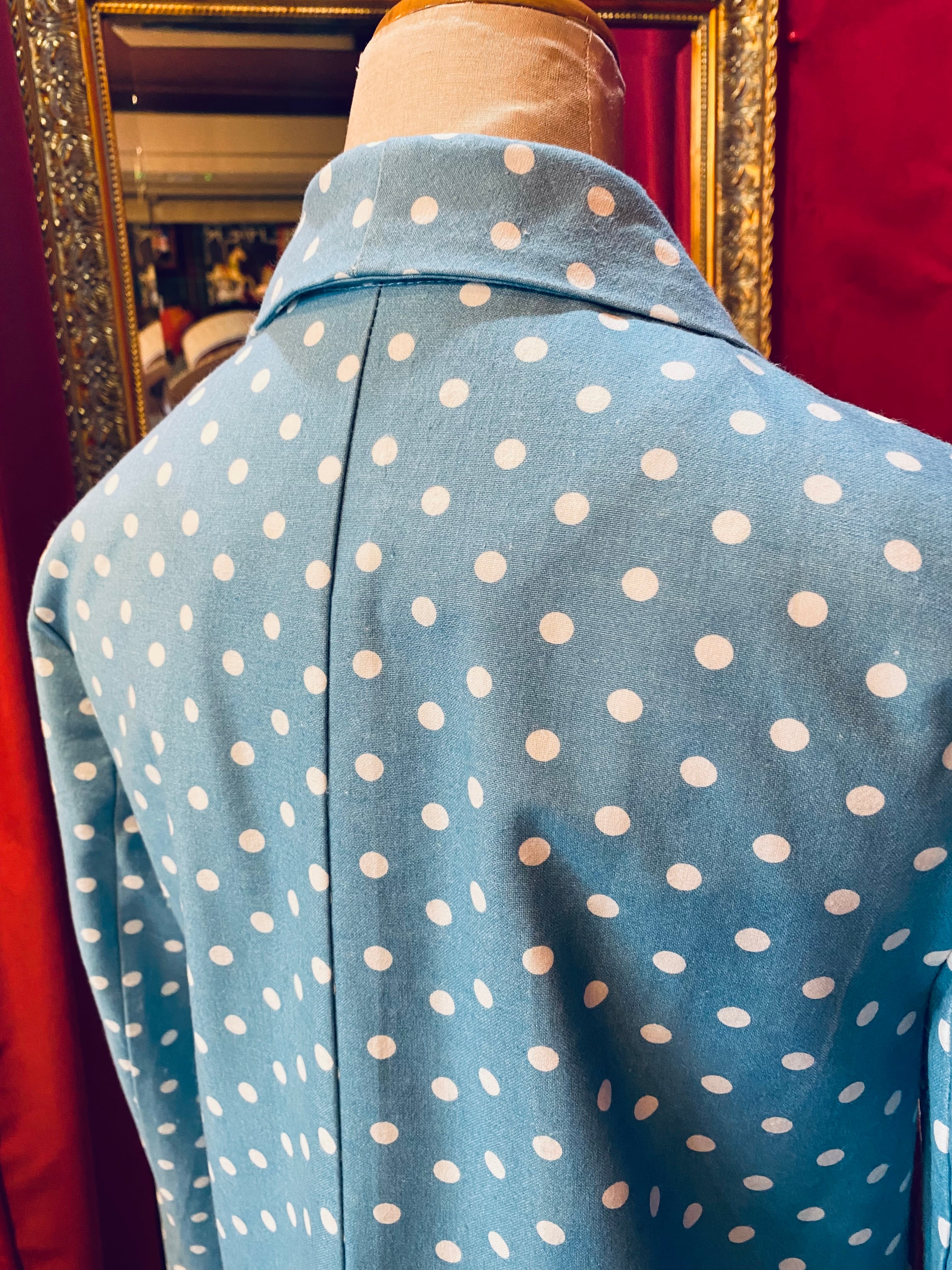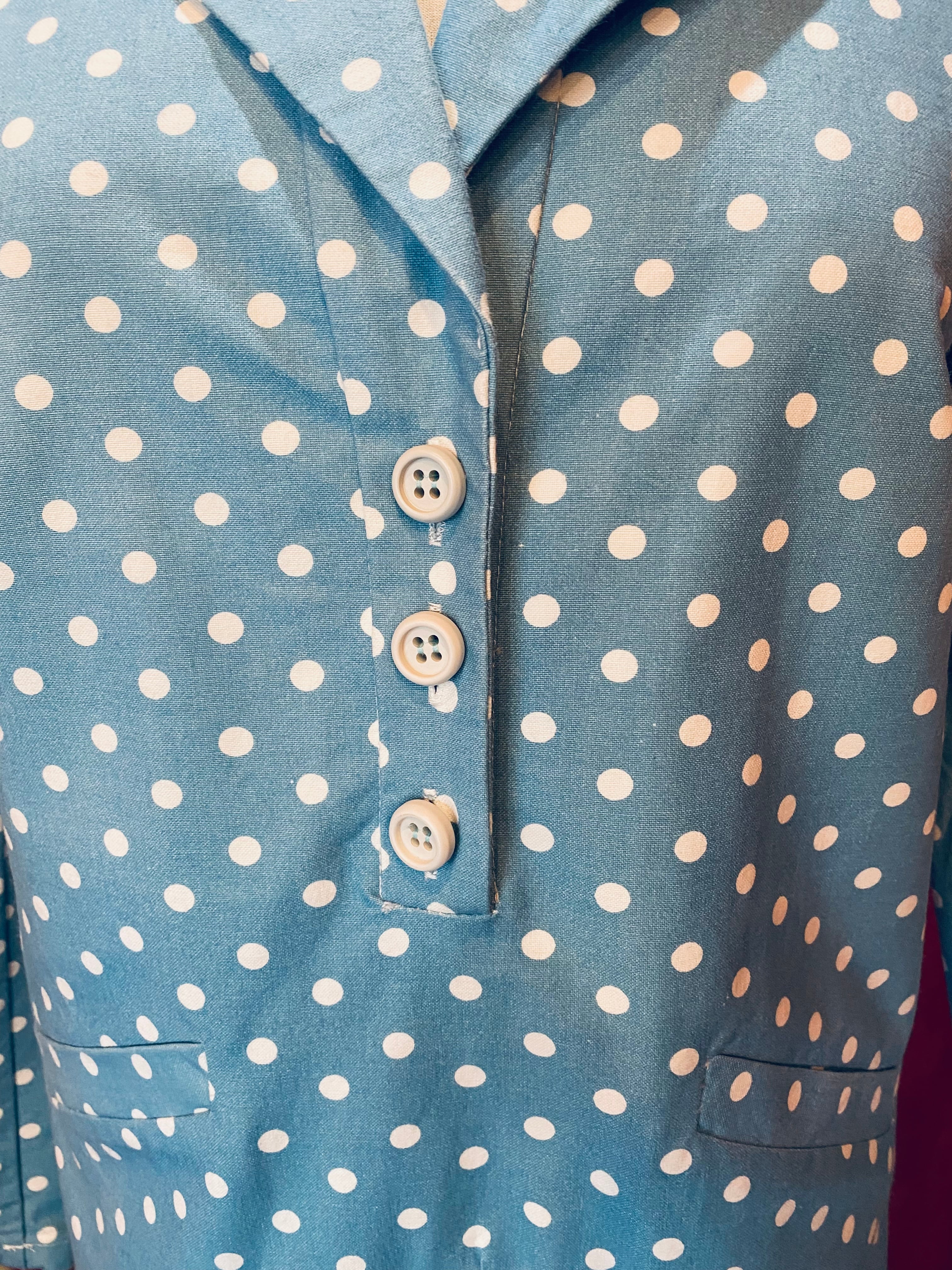 水色のドット柄がとにかく可愛く!カラー、フロントのボタン、プリーツ、デザインが上品で女性らしくシルエットも美しいです。デッドストックの様に状態は非常に良く、ポケット部分はまだ、しつけ糸が付いたままです。お帽子やアクセサリーとの相性も良く色んなコーディネートで楽しんでいただけます。女性らしくパンプスでも、ちょっとマニッシュにスニーカーでも♡生地も厚手でしっかりしており、裏地はありませんが透け感はございません。