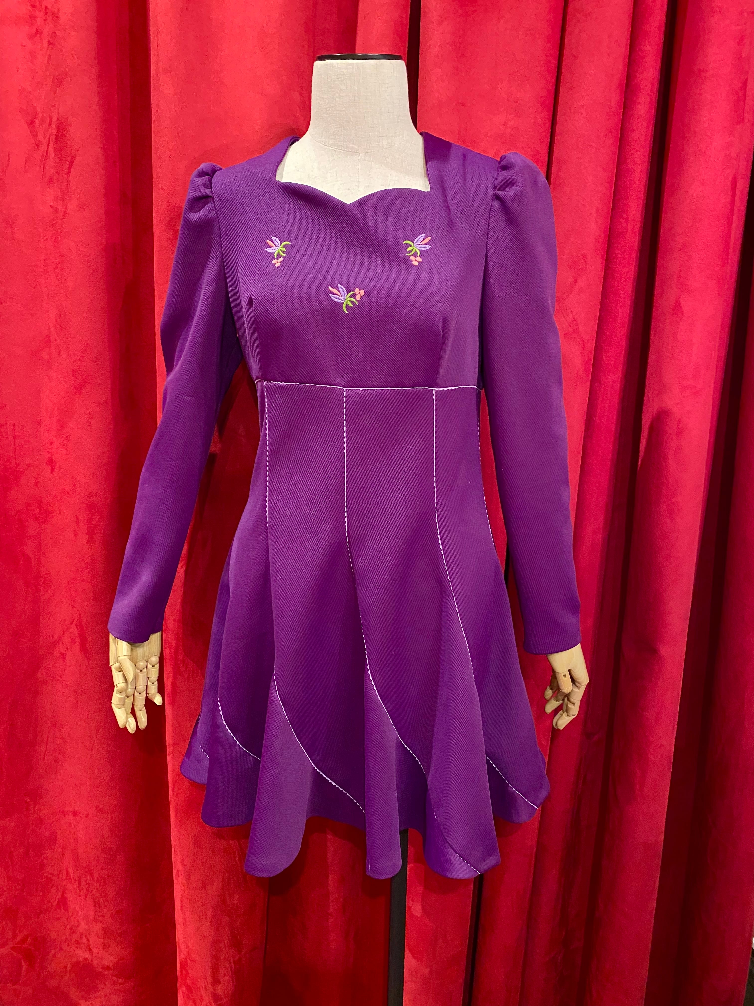 60~70年代らしいシルエットがたまらなく可愛いワンピース♡スカートが女の子らしく、現代ではなかなか無いデザイン。パフスリーブも素敵で可愛らしさと上品さを兼ね備えた1枚!!胸元にはお花の刺繍があしらわれております。