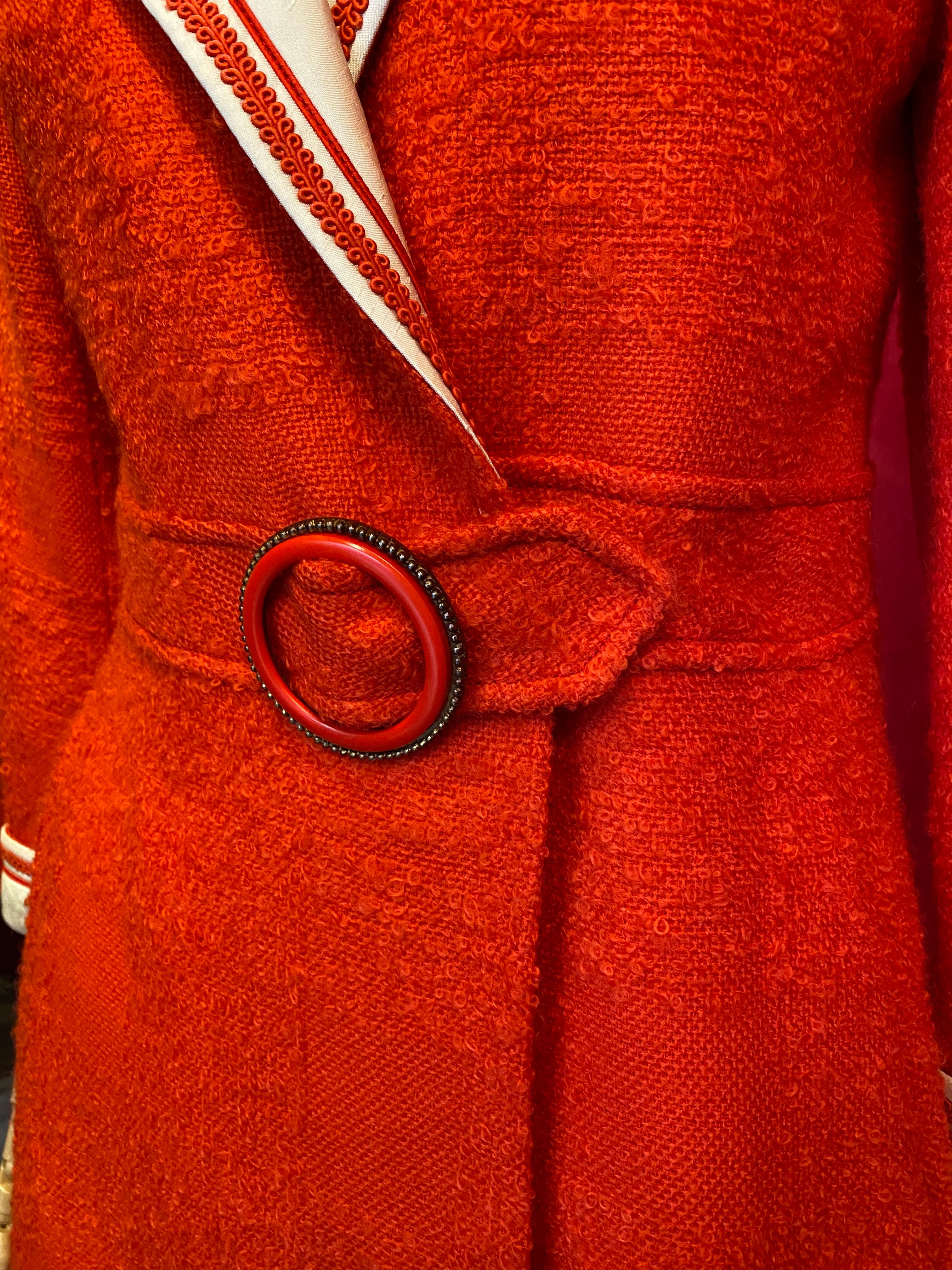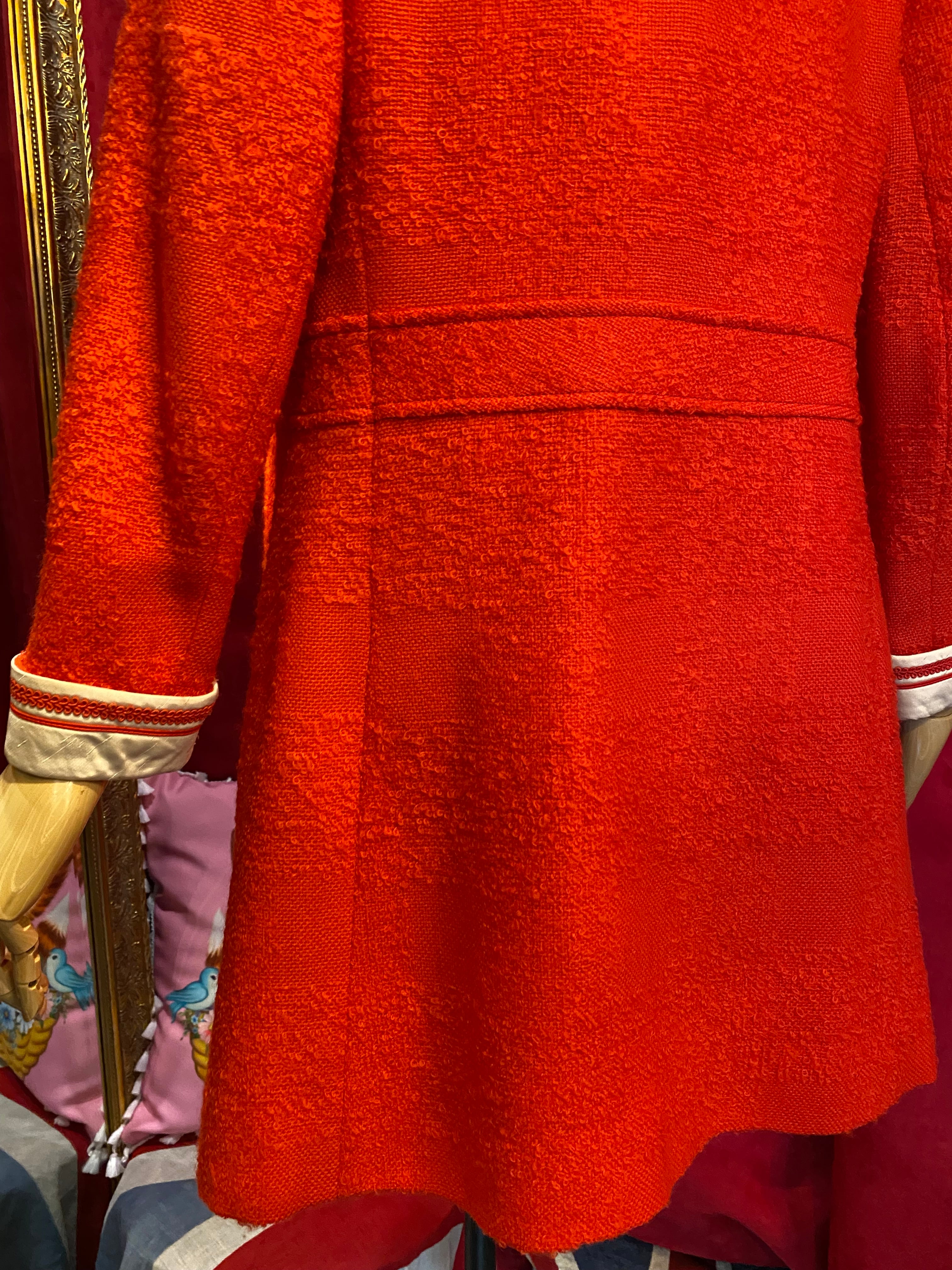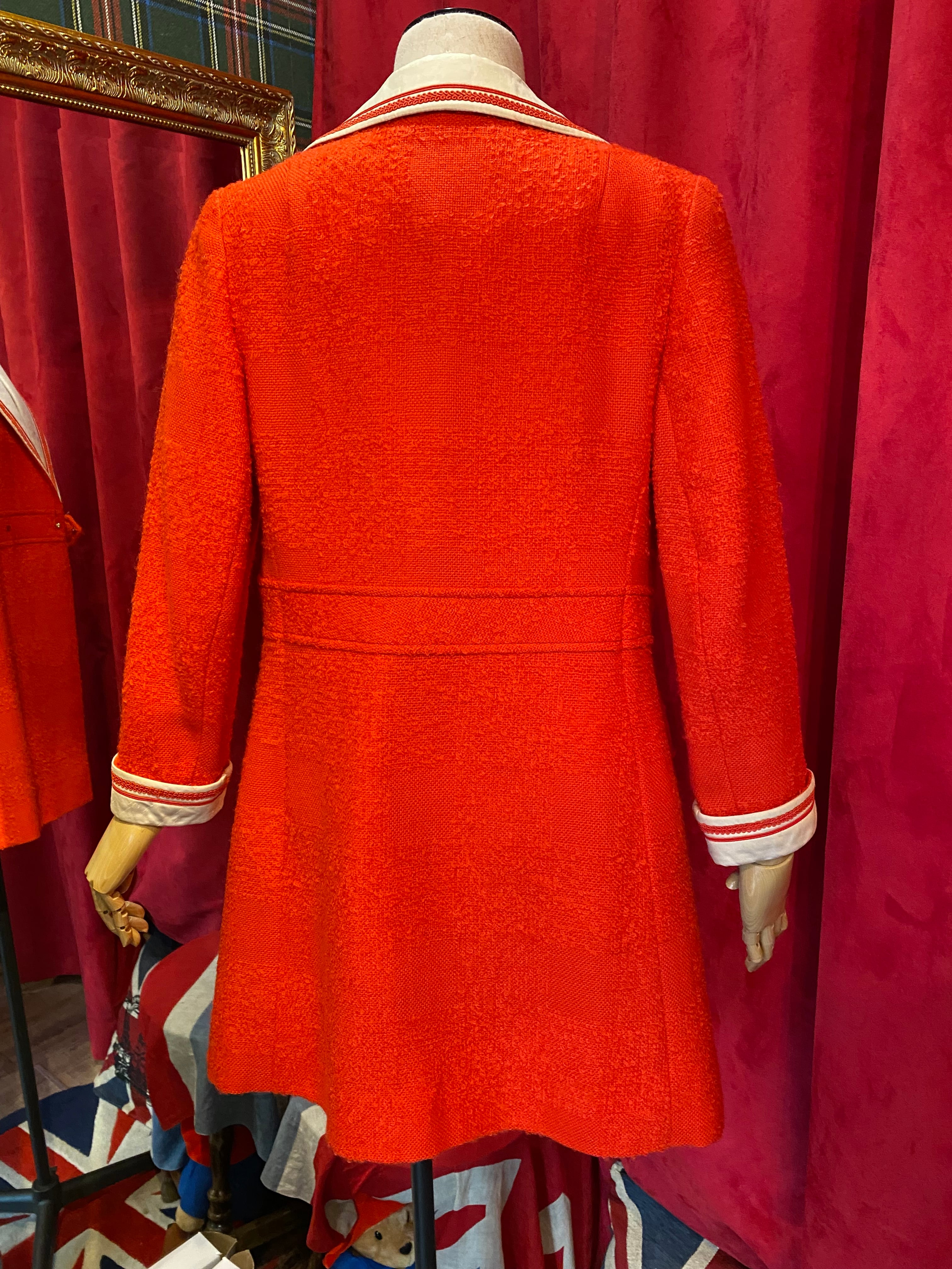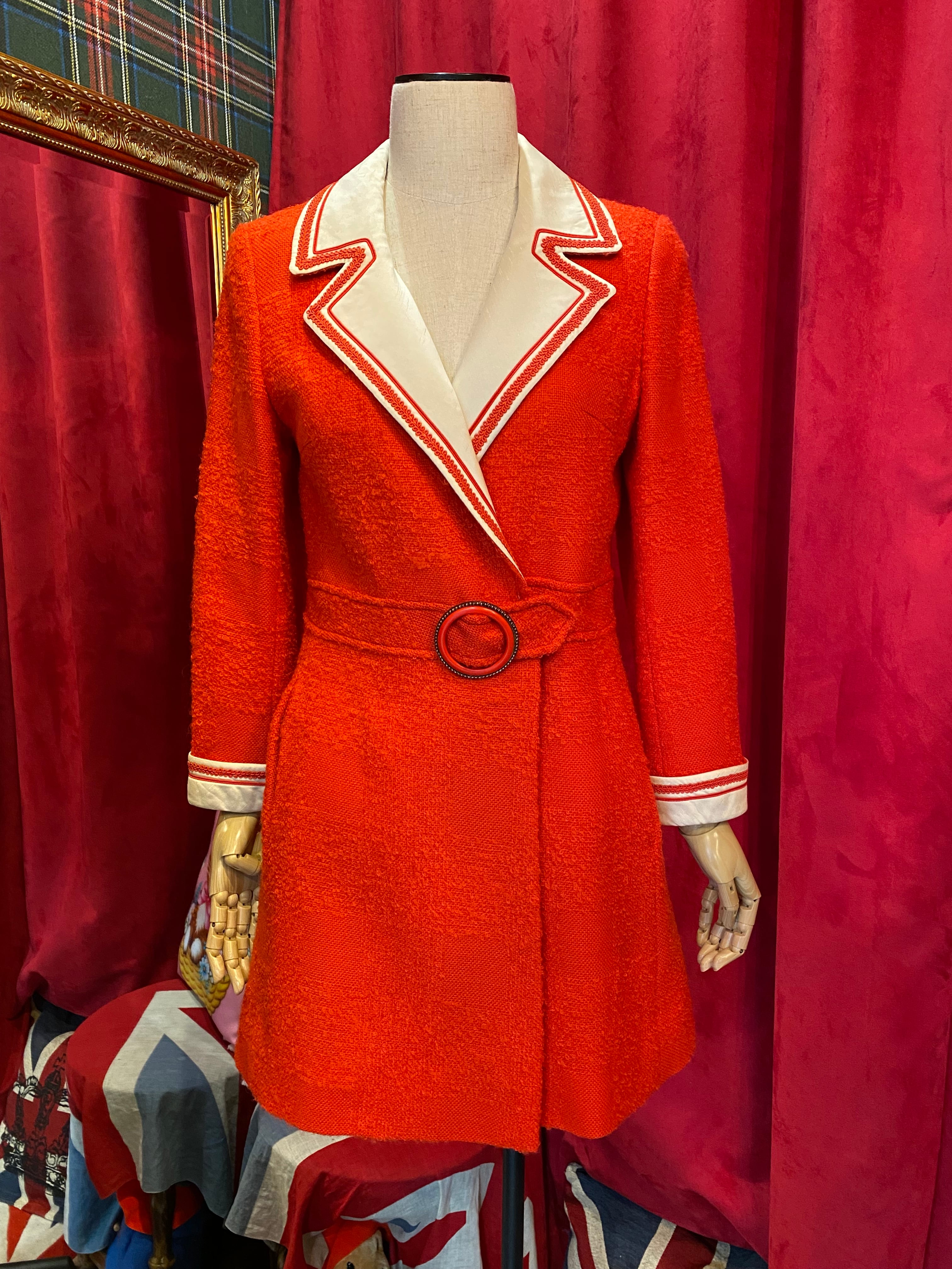 60’sらしい美しい朱色に、セーラーカラーがとってもキュート!!カラー、お袖部分はクリーム色で素材はシルクになっております。なので高級感もあり長く着ていただける1枚です。
