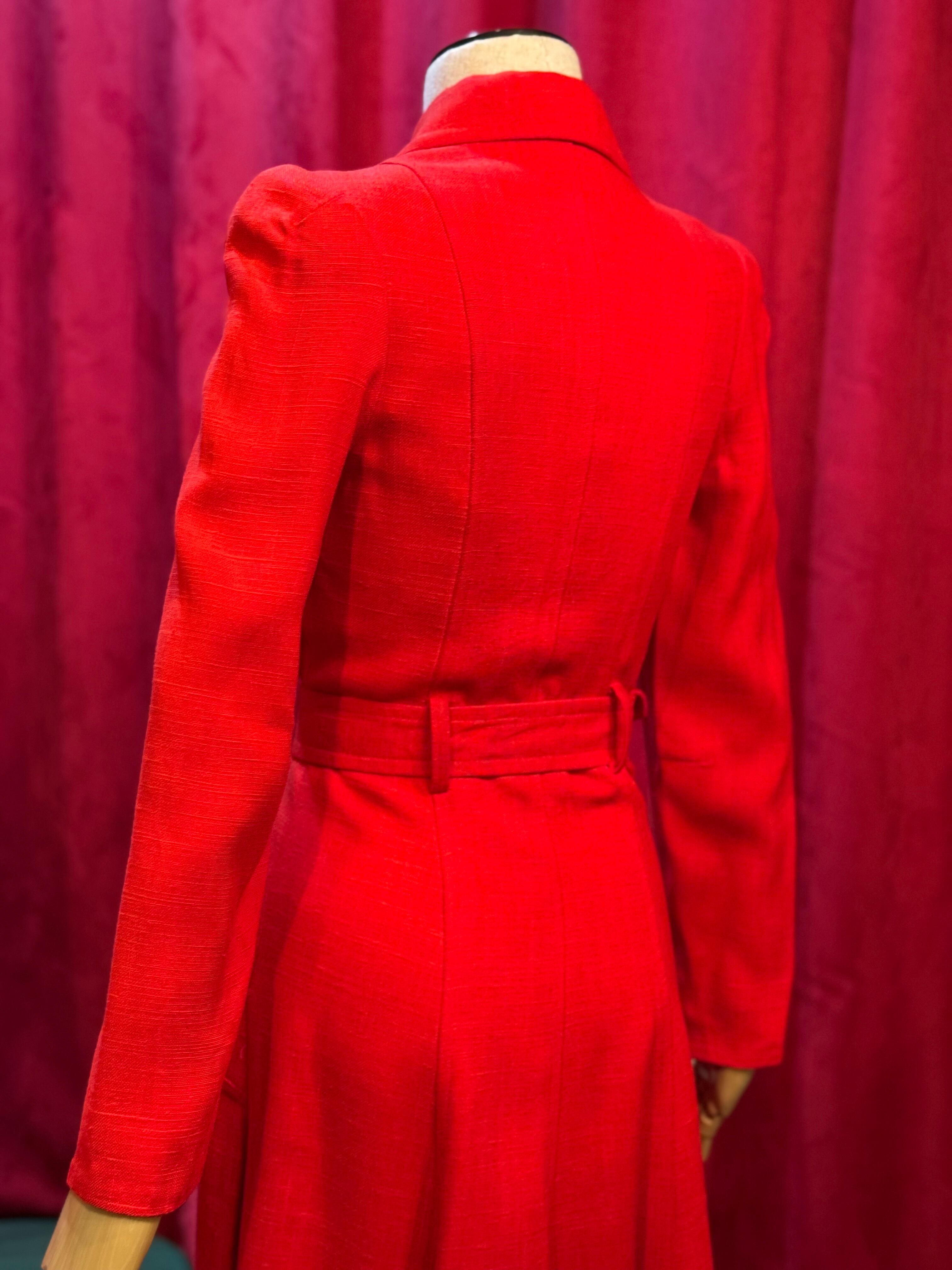 真っ赤な美しいロングコート。ベルト付きなのでスタイルを良く見せてくれる1枚。