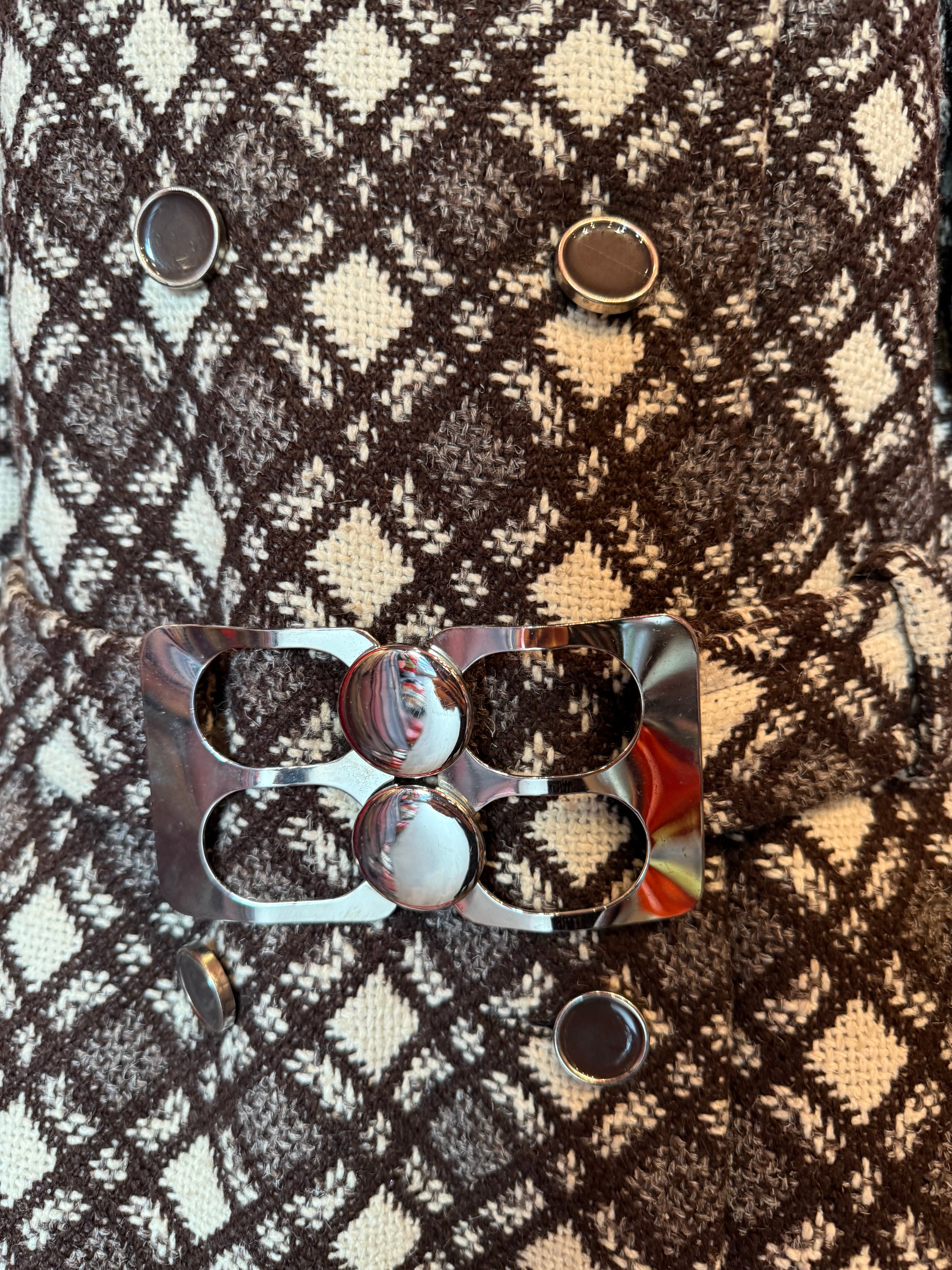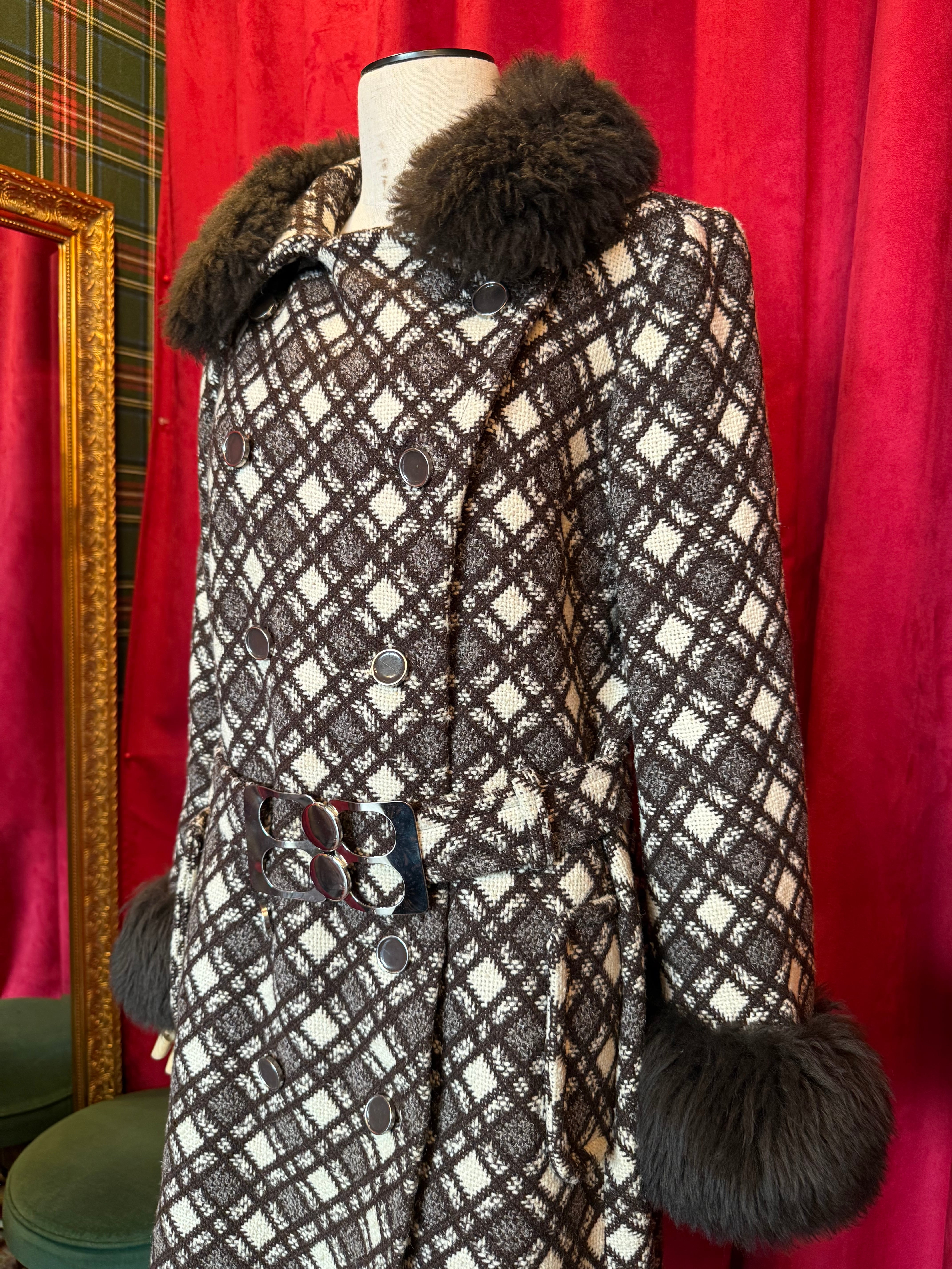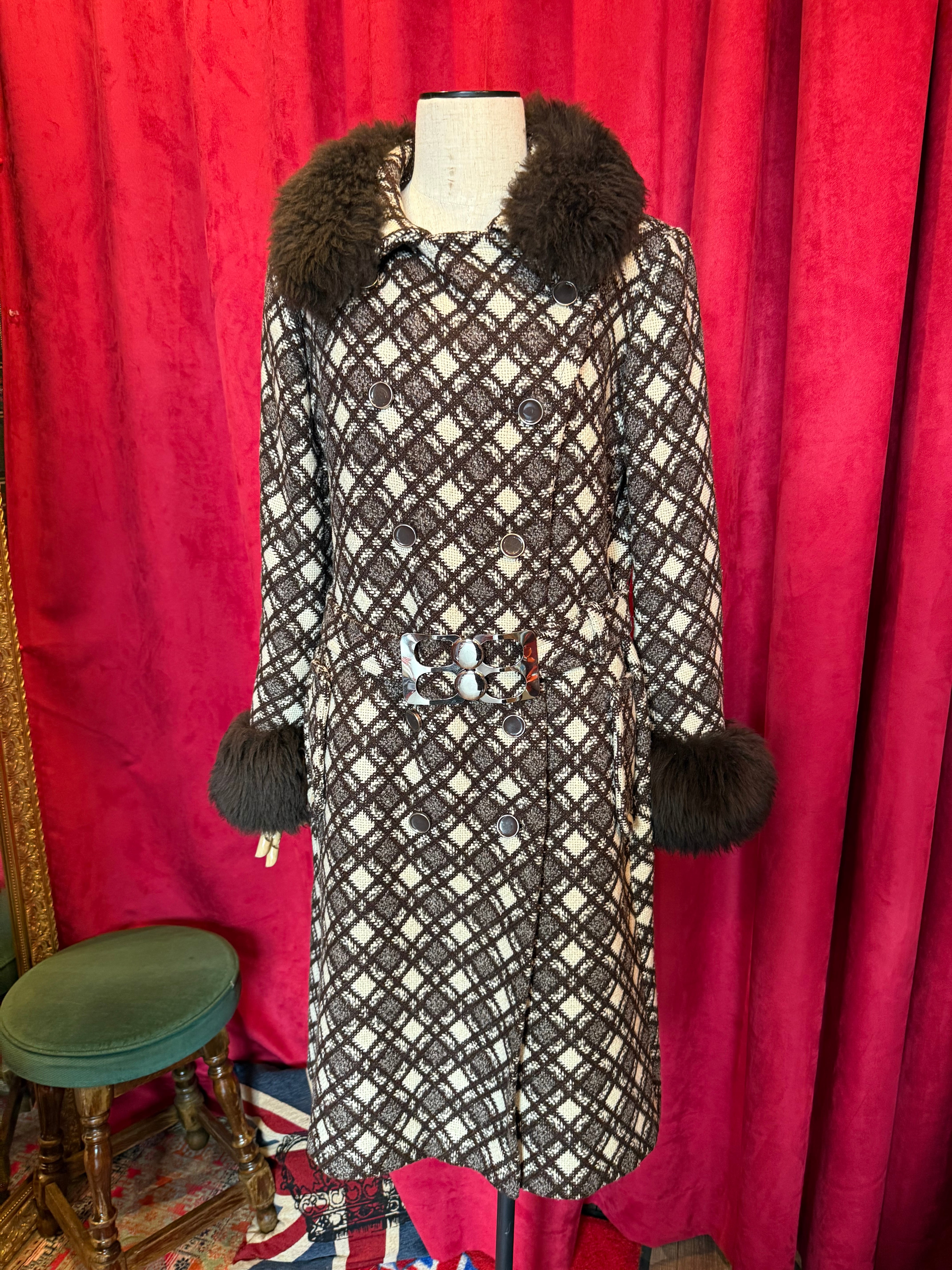 取り外しはできませんが襟、袖部分はフェイクファー付き。そしてベルトのバックル部分は60年代らしいスペイシーなデザイン。映画に出てくるようなゴージャスなコート。